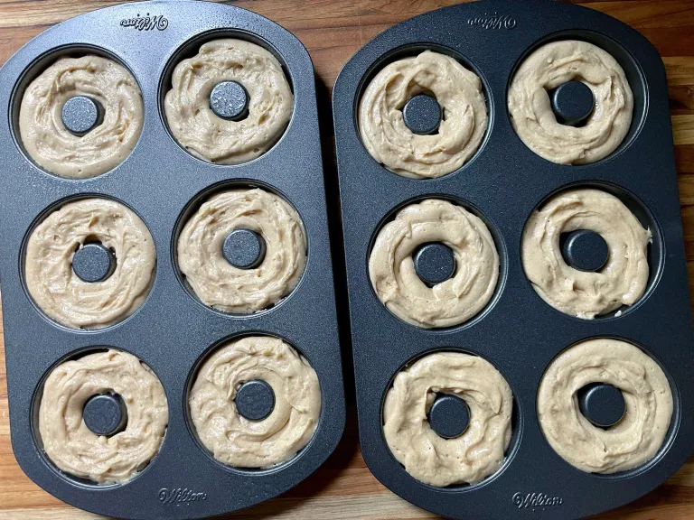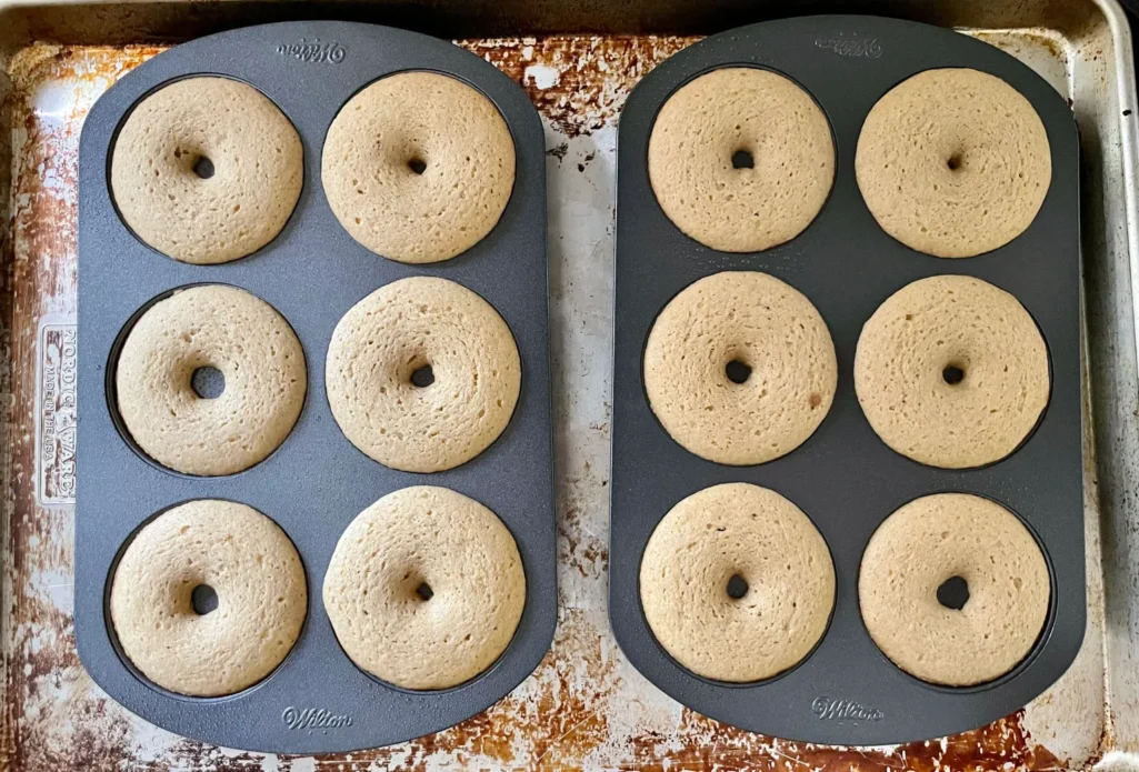 - Preheat the oven to 350 degrees and lightly spray two (six donut) donut pans, or muffin tins with cooking spray. In a large measuring cup or batter bowl, whisk together flour, baking powder, sea salt, nutmeg, and 1 teaspoon cinnamon.
