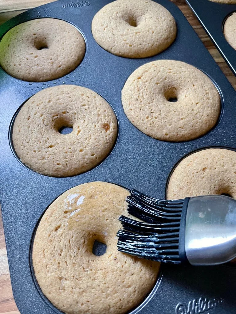 - Get a sheet pan to turn the buttered donuts out and set that nearby. Then, while the donuts are still in the pan, brush the tops with butter (you can do one tin of donuts at a time), then flip the pan over onto that other sheet tray and brush the bottoms with the melted butter.