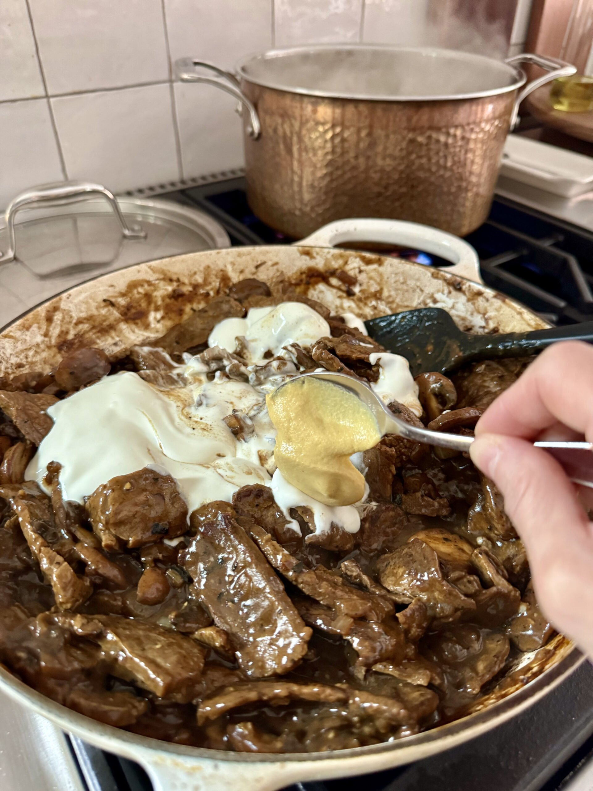 Off heat, add the sour cream and Dijon mustard. Carefully stir in the sour cream to fully incorporate. Taste for seasoning and add more kosher salt if needed.
