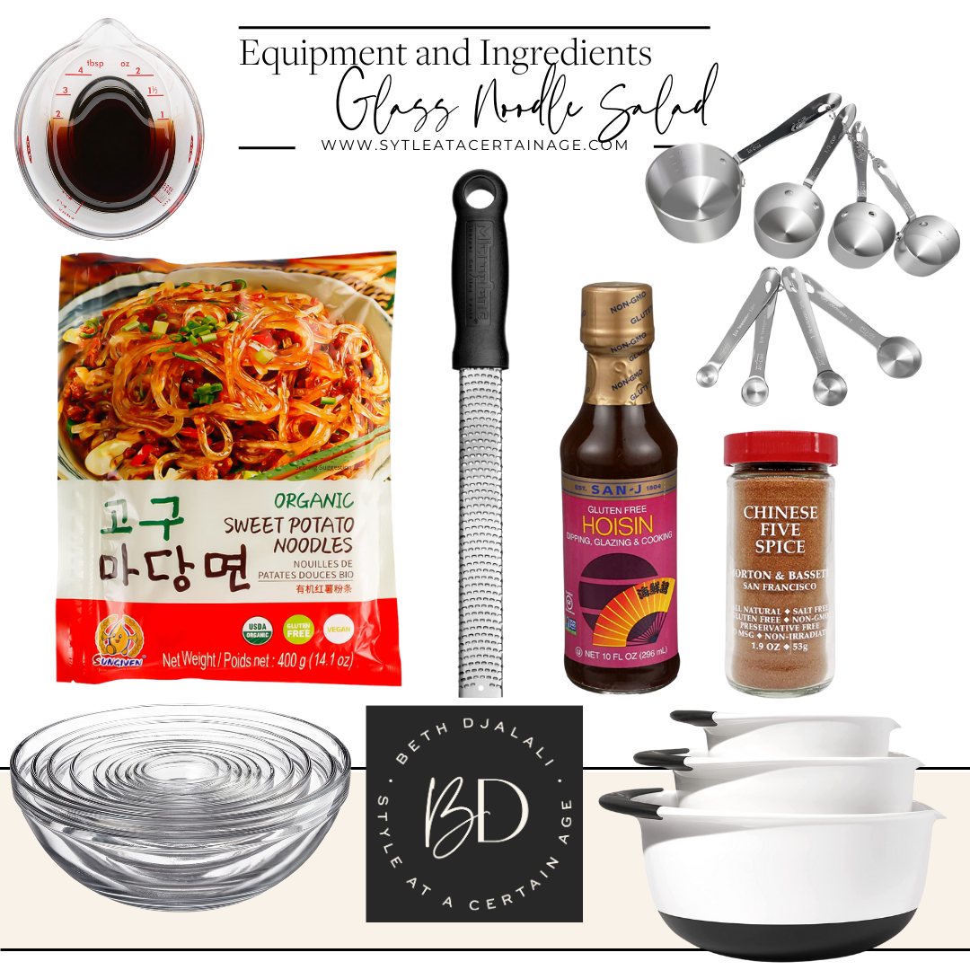 Organic Glass Noodles | Hoisin Sauce | Microplane Zester | OXO 2 oz. Measuring Cup | All Clad Stainless Steel Measuring Spoon and Cup Set | Anchor Hocking Set of 10 Nested Bowls | Chinese 5 Spice | OXO Good Grips Mixing Bowl Set