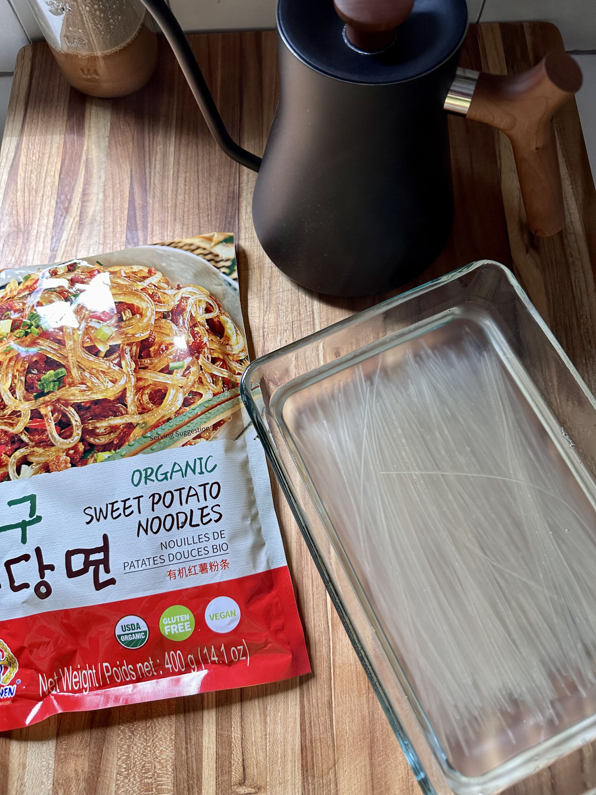 This recipe calls for 8 ounces of dried glass noodles. Place the dried noodles in a rectangular casserole dish and cover the noodles with freshly boiled water. Use a fork or silicone spatula to periodically stir the noodles back and forth. The noodles take about 3-4 minutes to cook. They will become transparent and soft. Drain the noodles in a colander and rise with cold water. Loosen them up with your hands as you rinse them. Set the noodles aside to cool further.
