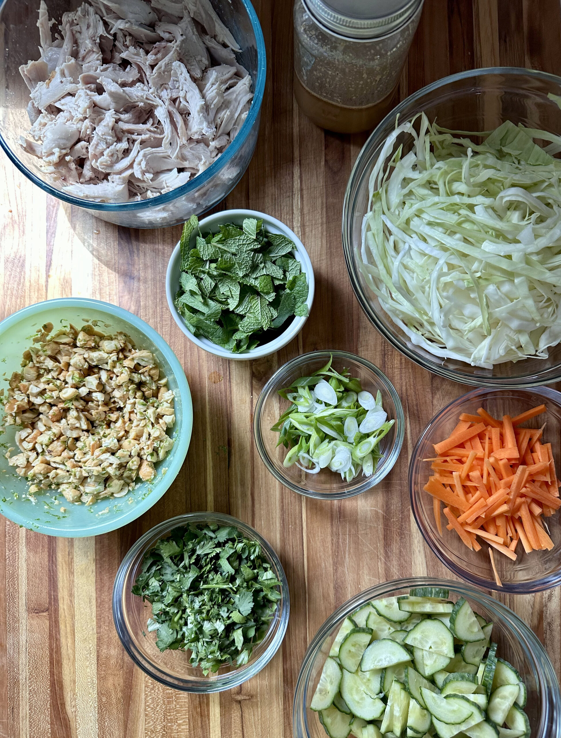 The most time consuming part of this recipe is the prep. We have thinly sliced cabbage, julienned carrot, sliced cucumber, shredded rotisserie chicken, chopped cilantro, mint and scallions. Then we have the dressing, the noodles and the lime cashew crunch topping.