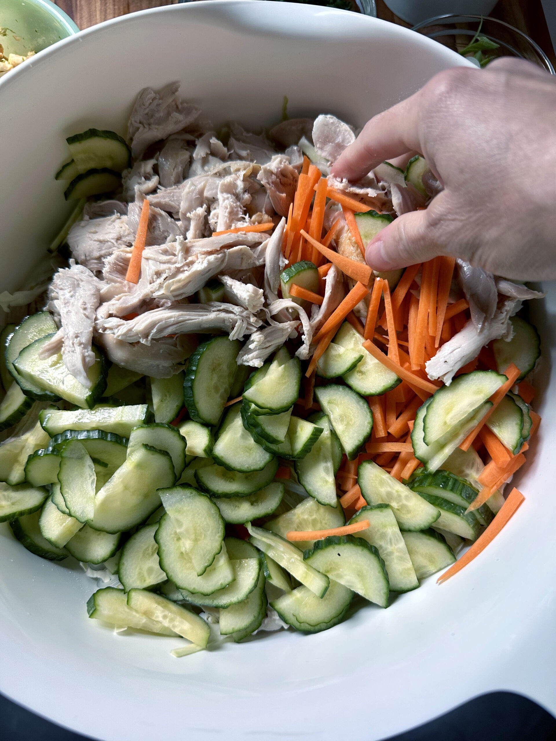 Then add the shredded chicken, julienned carrot and cucumber slices. Use your hands to mix thoroughly.