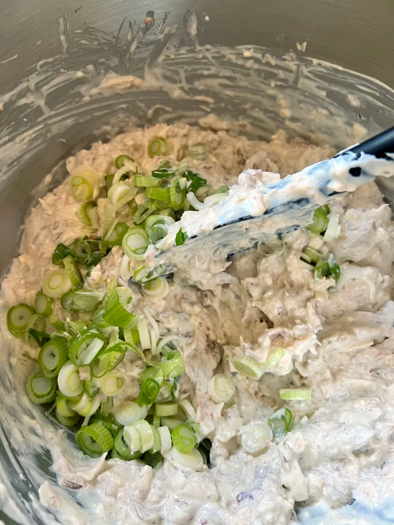 Preheat the oven to 375 degrees. Slice the scallions, and separate the white and light green parts from the green parts. The white and light green parts will go into the dip, while the green parts will go on top after it comes out of the oven.