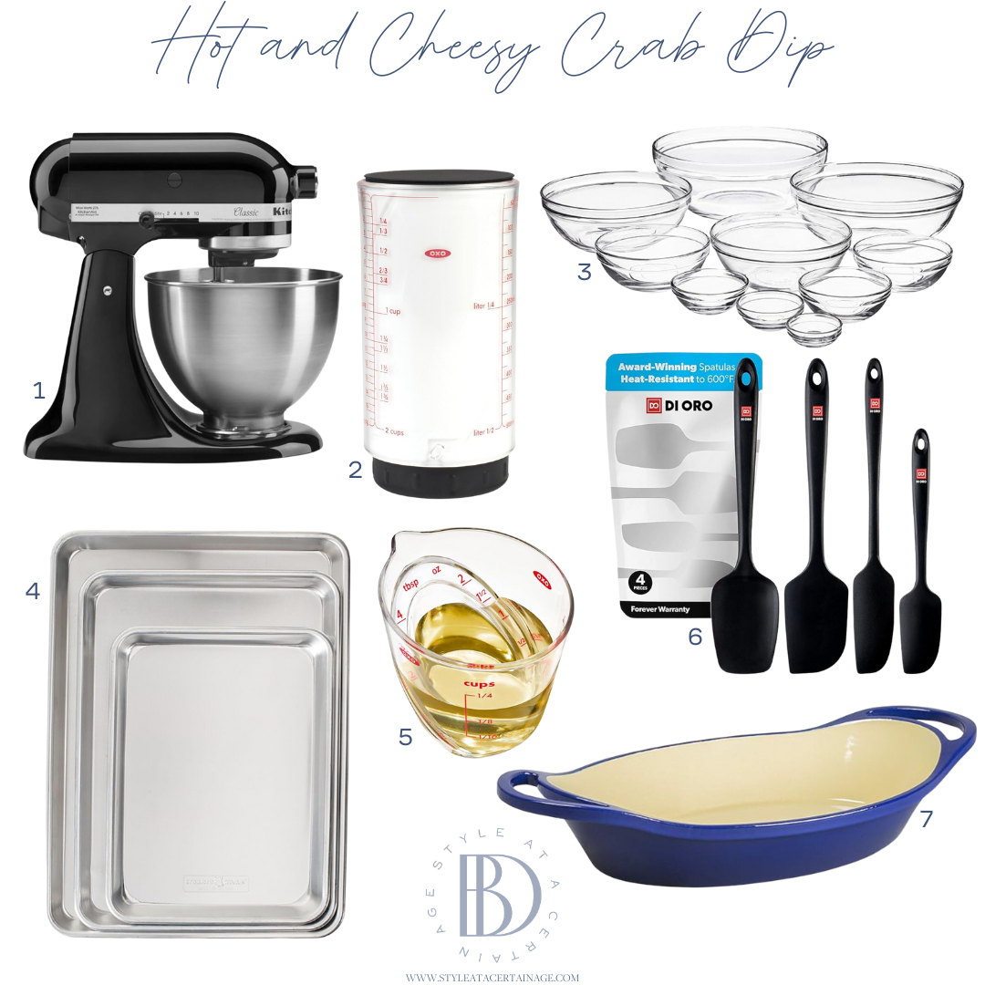 1. KitchenAid Stand Mixer 2. Adjustable Measuring Cup 3. 10 Piece Mixing Bowl Set 4. Sheet Pan Set 5. Mini Angled Measuring Cup 6. Silicone Spatula Set 7. Lodge Oval 2-qt. Casserole Dish