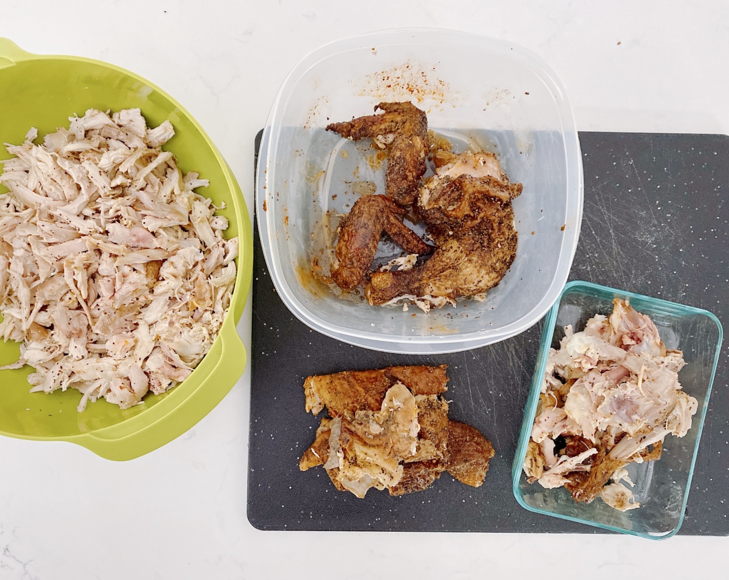 As for the chicken salad recipe, the ratios depend on how much leftover chicken you’re working with. But here’s a baseline if you’re starting with a full chicken: