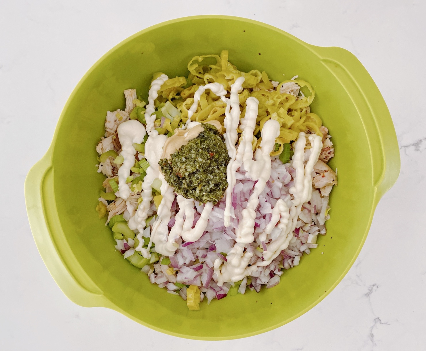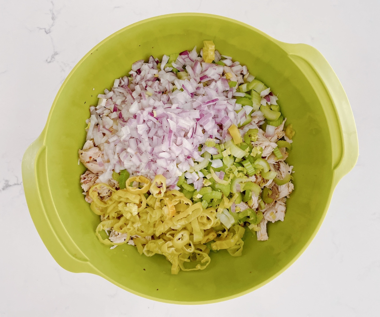 Then I have sliced pepperoncinis. They add a little heat, a soft texture and the right amount of acidic vinegar flavor to offset the richness of the mayo and the chicken.