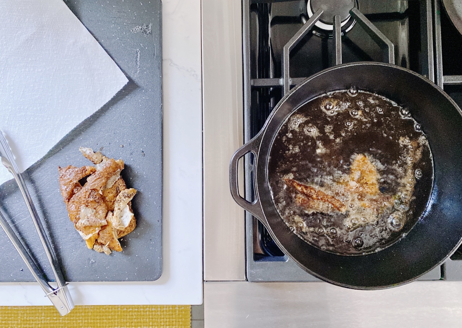 This is totally optional. But a nice way to put this chicken salad way over the top is to make some cracklins out of the chicken skin. I have about half an inch of vegetable oil in my dutch oven and once it’s around 350 degrees, drop in your skins. When they puff and crisp up, pull them out to drain on a paper towel. Once they’re cool, slice or chop them into smaller pieces. I won’t mix them into the salad because I want them to retain their crispy, crunchy texture. So instead, they will be a topping.