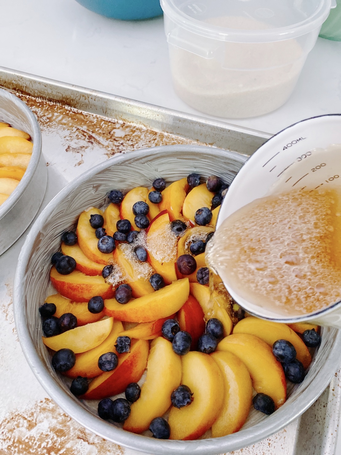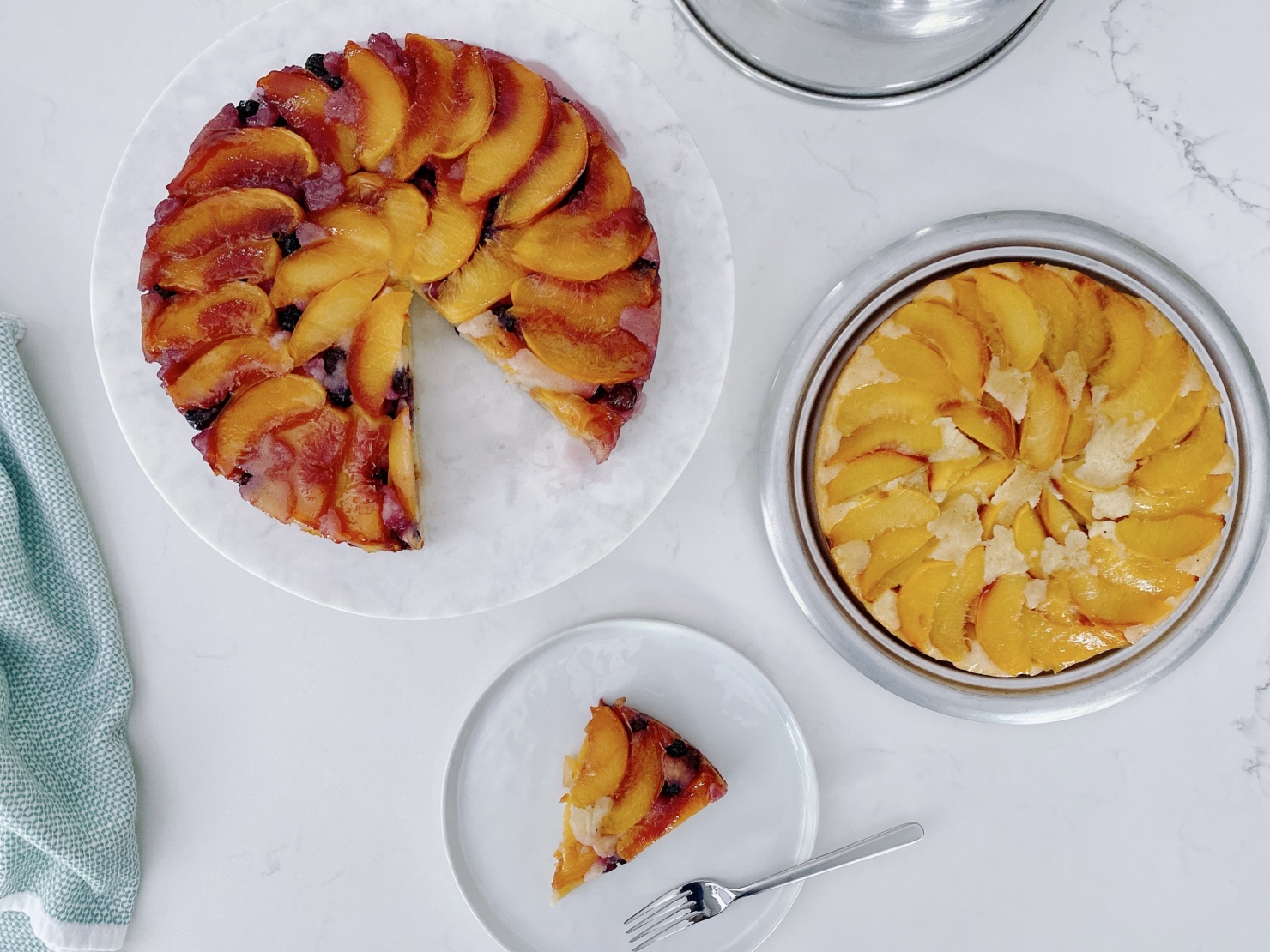 The blueberries filled in the spaces between the peaches preventing the batter from leaking through. Which, aesthetically, I think made for a prettier cake. In hindsight, I should have created a tighter pattern with the peach slices. The cake itself is not too sweet and so goes nicely with the caramelized sugar. I agree with the author, the cake is best on the day it’s made. Day two found it a little on the dry side, but it did go well with coffee.
