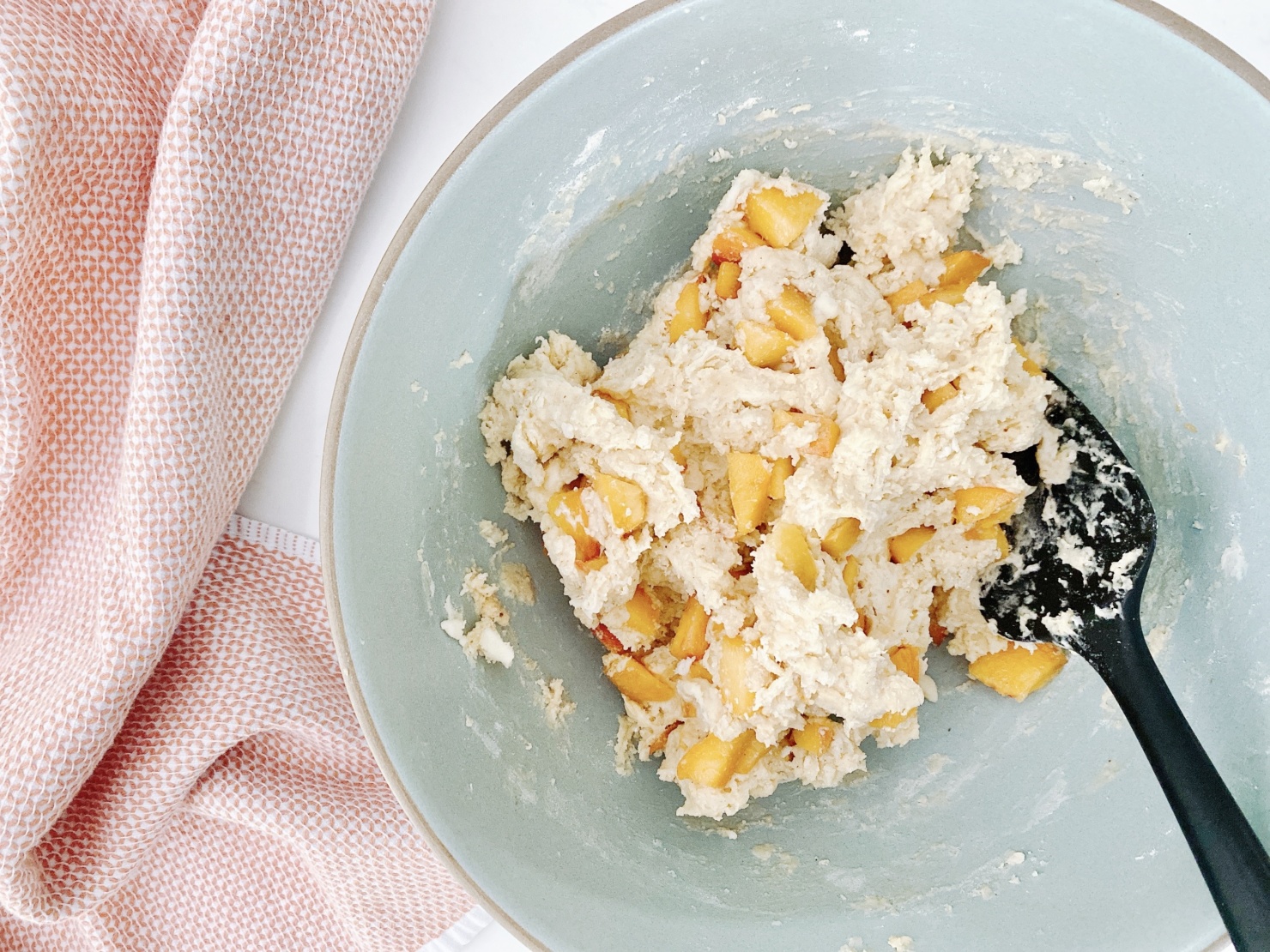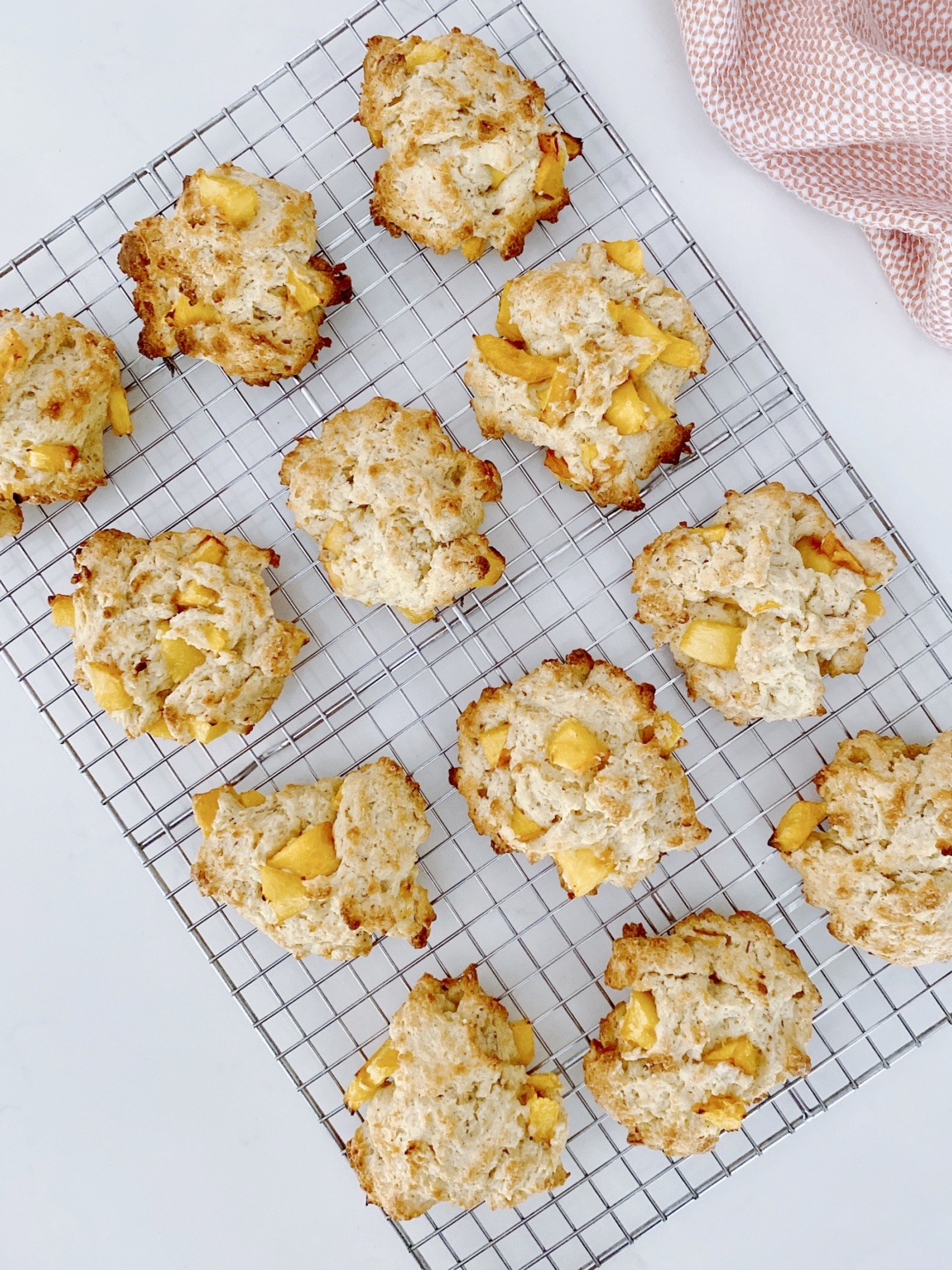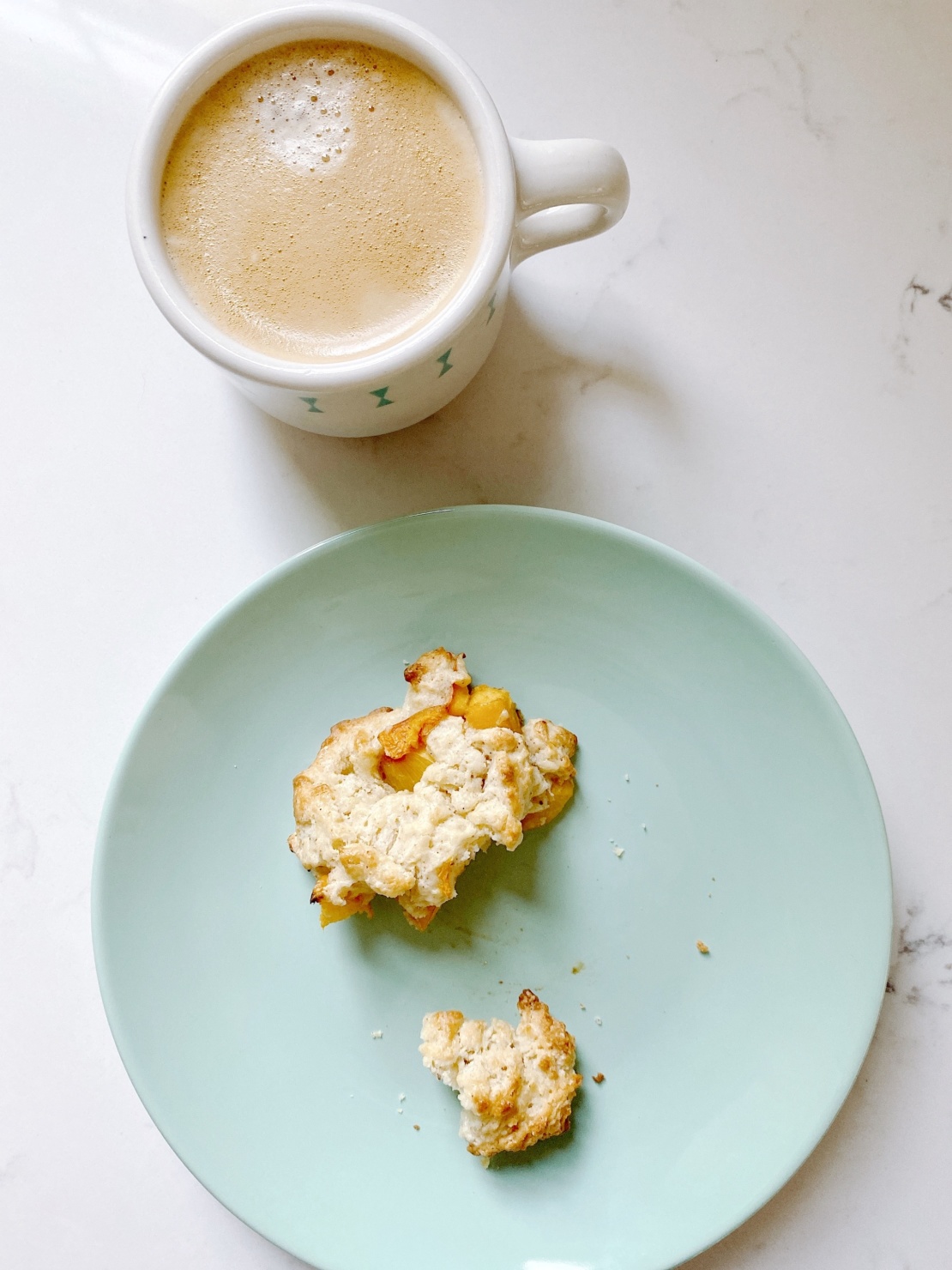 I really love a good scone. Soft and buttery on the inside with a slightly crunchy, golden exterior. I was craving drop biscuits when I decided to make these, actually. Slightly sweet and loaded with chunks of fresh peaches, these scones were perfect for breakfast with coffee.