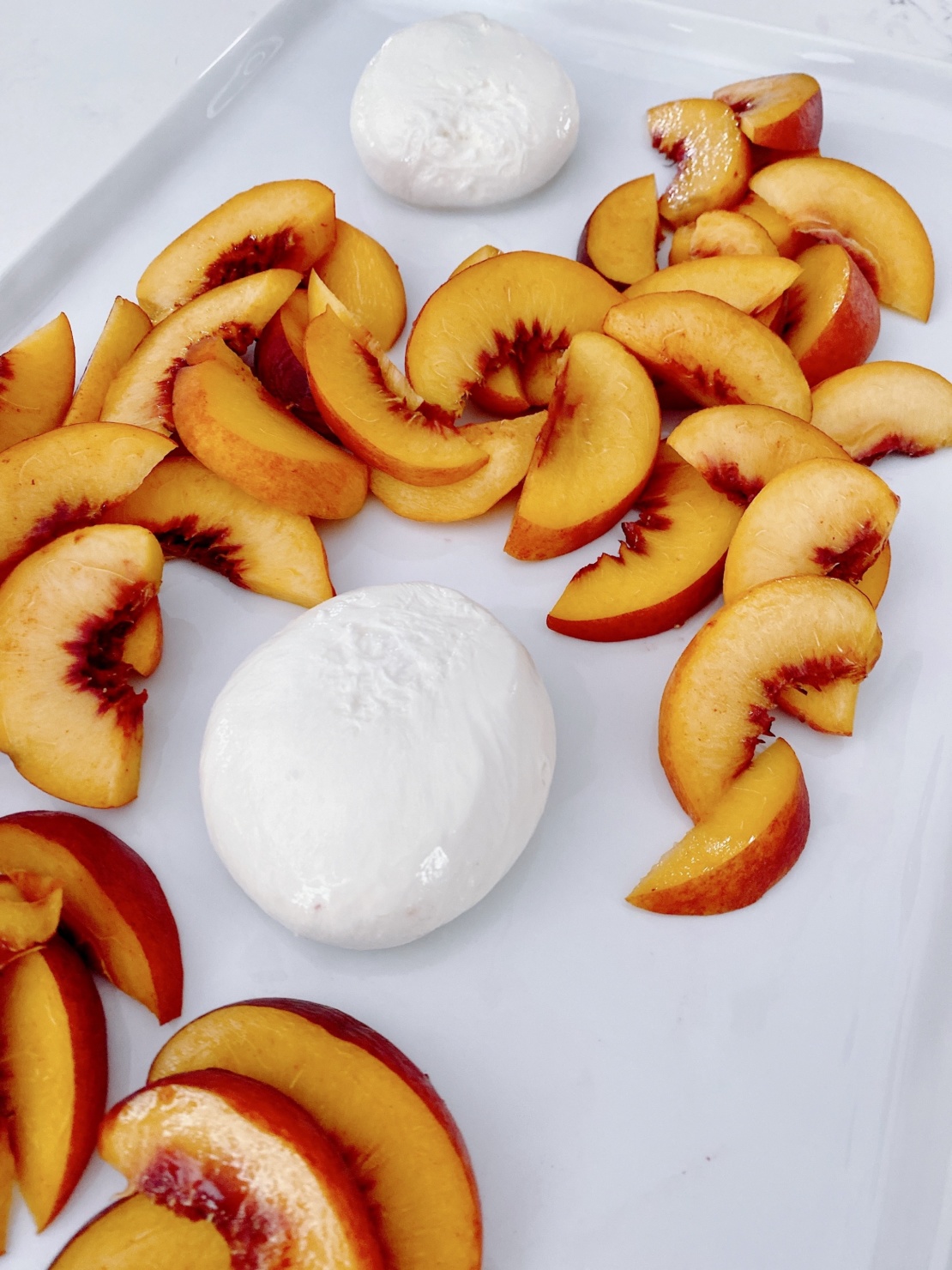 If you are not familiar with Burrata, it’s a sphere of fresh mozzarella filled with stracciatella. Stracciatella is a tangy, creamy mixture of frayed mozzarella and cream. Burrata is so luscious and rich, it really goes perfectly with peaches and takes this simple salad up a notch.