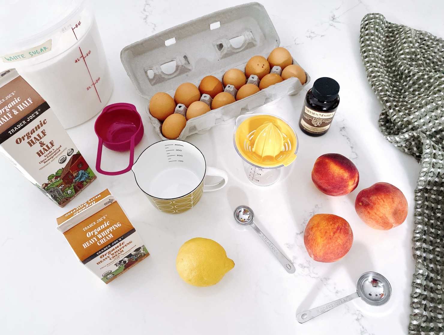 Hello everyone! Welcome back to Kelly’s Kitchen, it’s great you’re here today. Our subscription from The Peach Truck (a gift from our wonderful general contractor, Jessica Webber) has kept us swimming in peaches all summer. It’s been fun and sometimes challenging (in a good way!) to come up with ways to use them. It’s safe to say there will be more peach recipes coming to this column! But today, we are making peach ice cream.