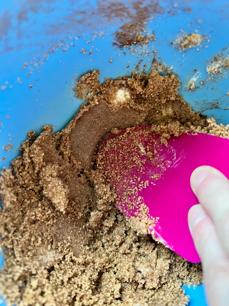- In a small bowl, combine the cinnamon and the light brown sugar. Mix together well, then add the softened butter. Use a firm silicone spatula to smash the butter into the sugar and cinnamon until the butter is totally incorporated.