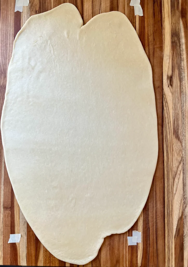 After an hour in the fridge, the dough should be roughly double in size. We want to roll the dough out to a 10 x 20-inch rectangle. Don’t worry if it’s not rolled into a perfect rectangle; we can stretch the dough once it’s filled to be more rectangular. I used 8 little strips of masking tape to mask out the 10 x 20 measurements on my work surface.