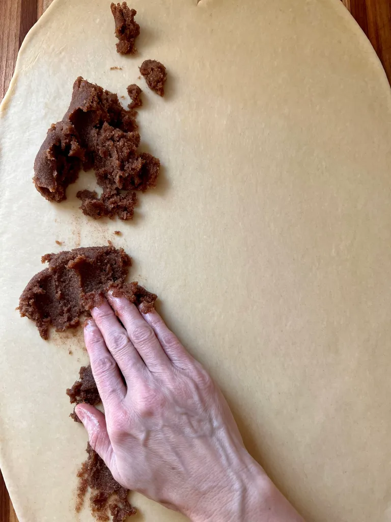 Spread the cinnamon sugar filling on one half of a long side of the rolled dough. Use your fingers and hands if you want to; it makes spreading an even layer easier!