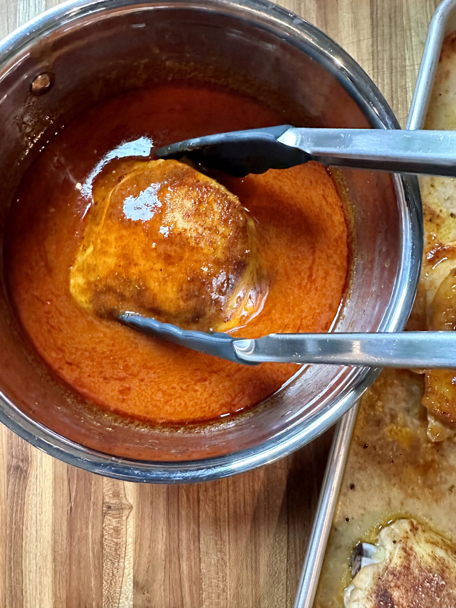 After 30 minutes in the oven, pull the chicken out and increase the oven temperature to 400 degrees F. Place the saucepan of Sweet Hot Sauce next to the sheet pan of chicken. Use tongs to carefully dunk each chicken thigh into the Sweet Hot Sauce, fully coating each thigh in the sauce – set the coated thighs back on the sheet tray as you go.