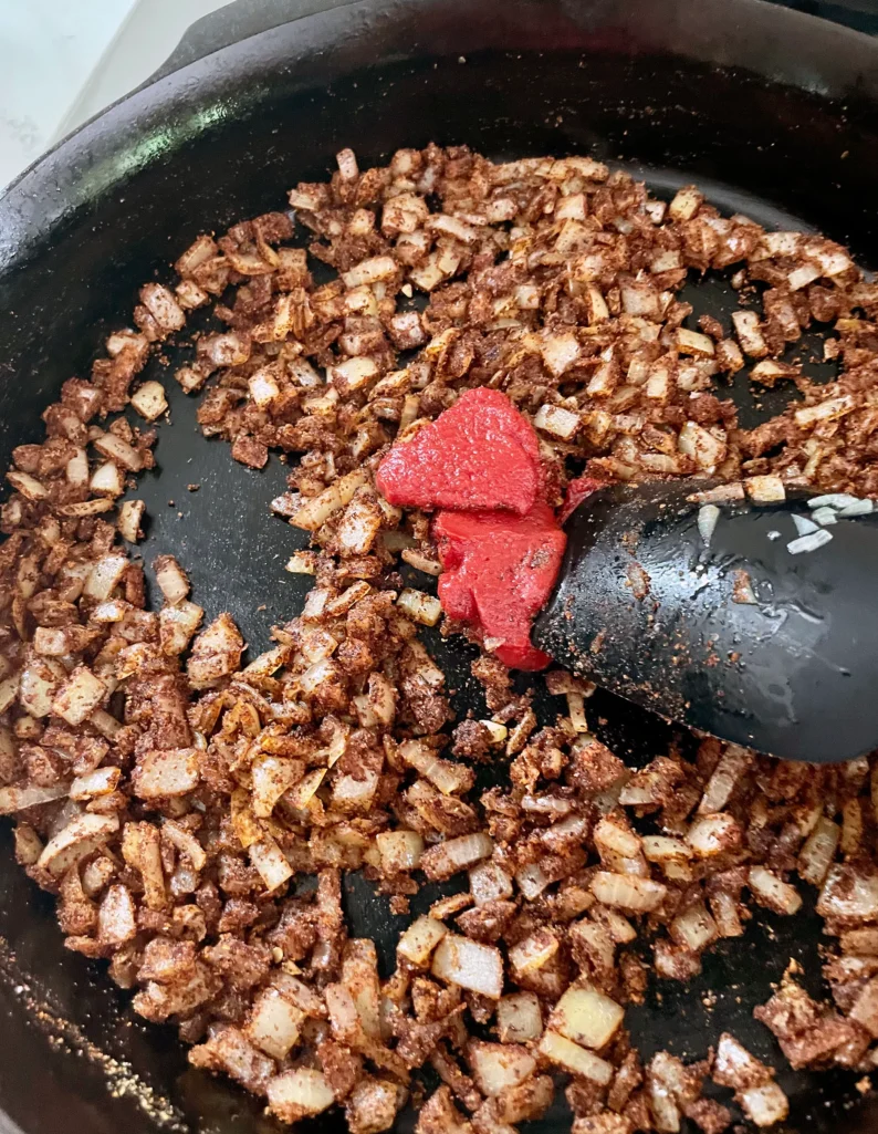 Cook while stirring until the spices are fragrant, about one minute. Then add the tomato paste. Stir to incorporate and cook the tomato paste until it darkens to a rust color, about 1 minute.