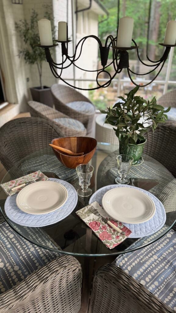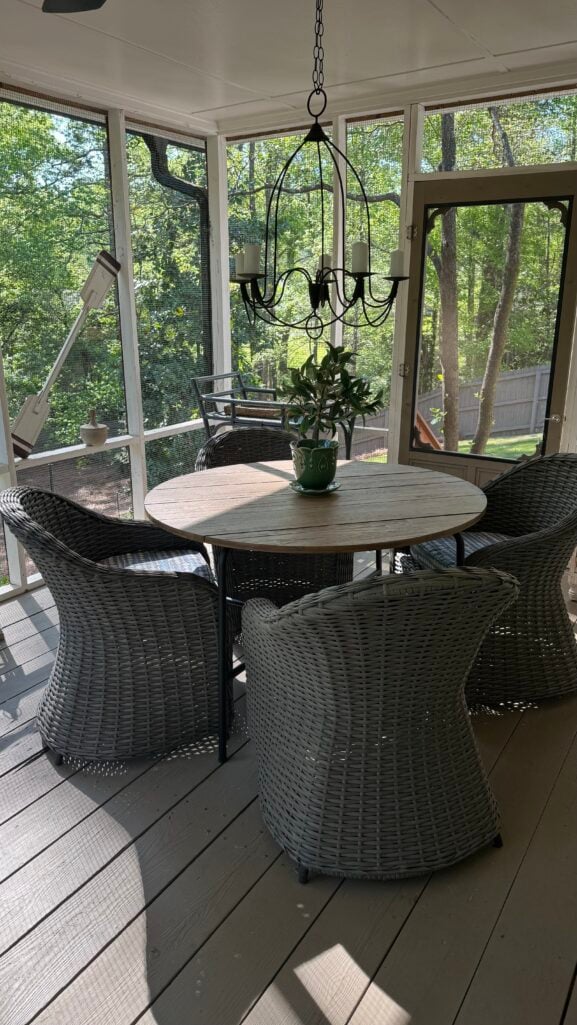 My porch sits at the back of the house, screened in and tucked beneath a canopy of Georgia hardwoods. The bones are simple: a round farmhouse table on a pedestal base, four curved wicker dining chairs in weathered gray, and a wrought-iron candle chandelier that swings gently when the ceiling fan catches it. A small topiary in a scalloped green cachepot anchors the center of the table. That’s the whole setup. But when the afternoon light filters through the trees and the candles are lit, it’s the prettiest room in the house — and it doesn’t even have walls.