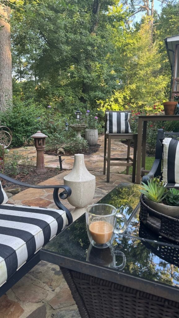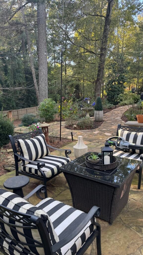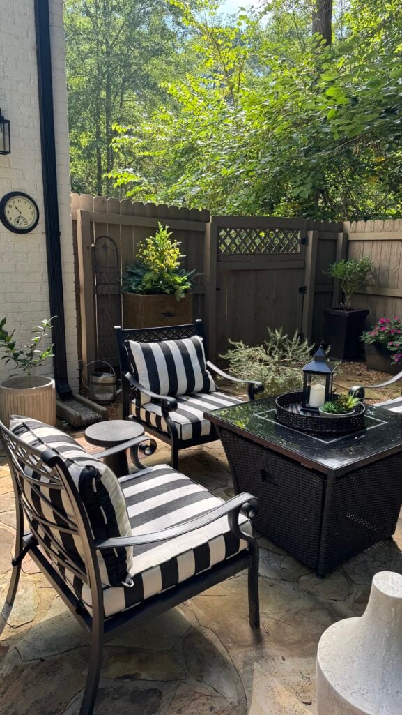 Nothing updates a patio faster than new cushions. I choose a fresh palette every two or three years — this spring, I’m leaning into black-and-white stripes (surprised?). Look for fade-resistant, water-repellent fabric, and cushions with removable, washable covers. Grandkids, pets, and sweet tea all count on the washable covers more than you’d think.