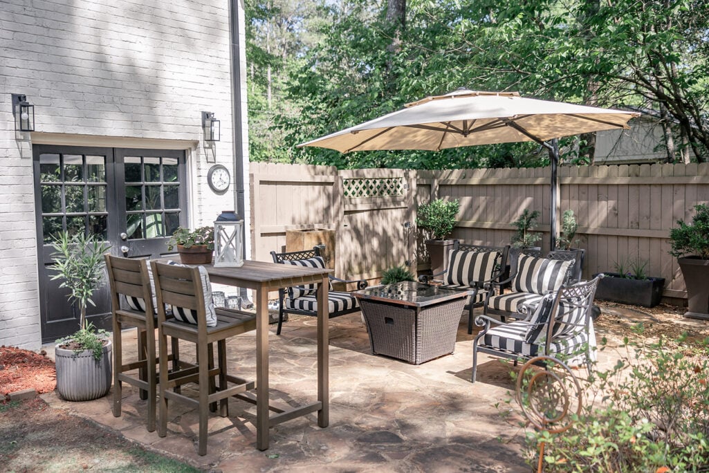 Once the forever pieces are in place and the refresh pieces are styled, the whole thing takes about an afternoon. I start with the chairs positioned for conversation — never pushed against the wall. The umbrella goes up and stays up through October. Planters get new herbs and annuals, lanterns get fresh candles, the cushions come on, and the string lights get strung last because I always need a ladder, and I always put it off.