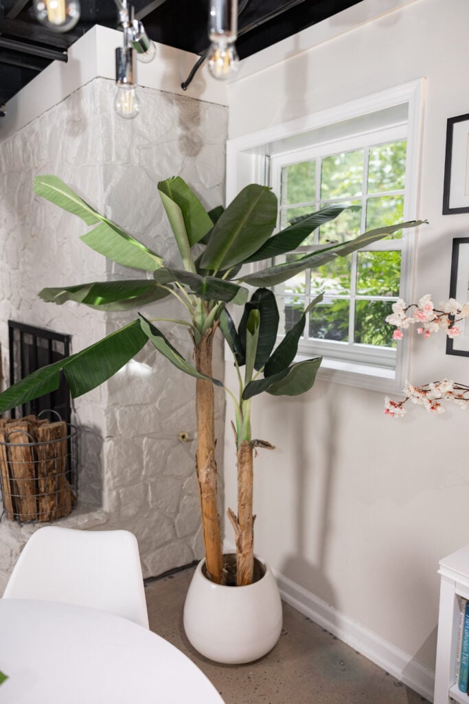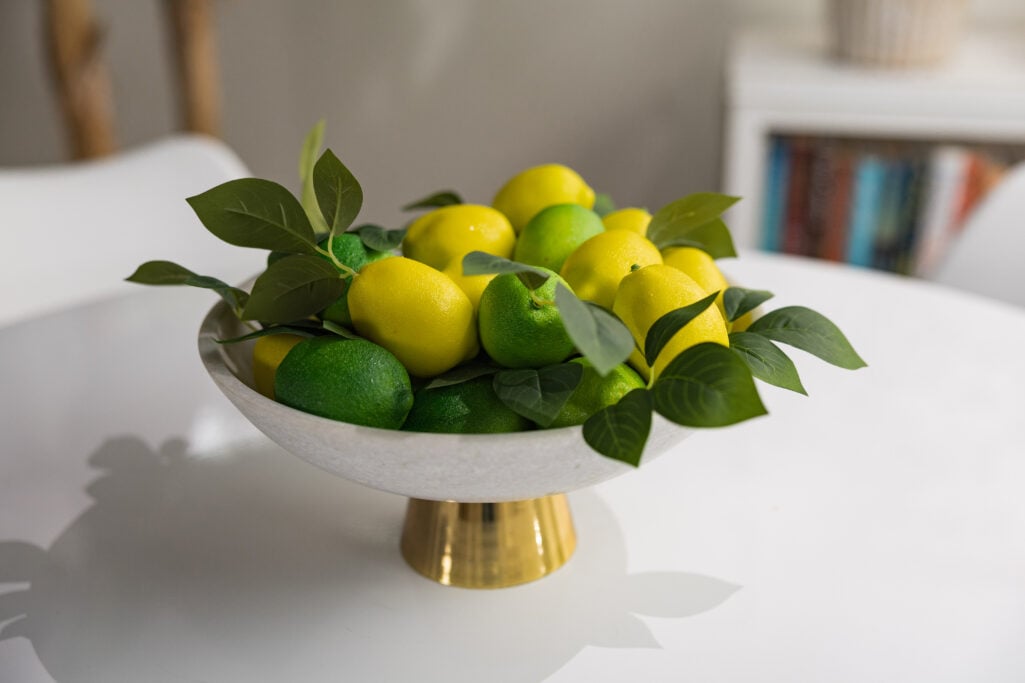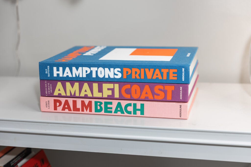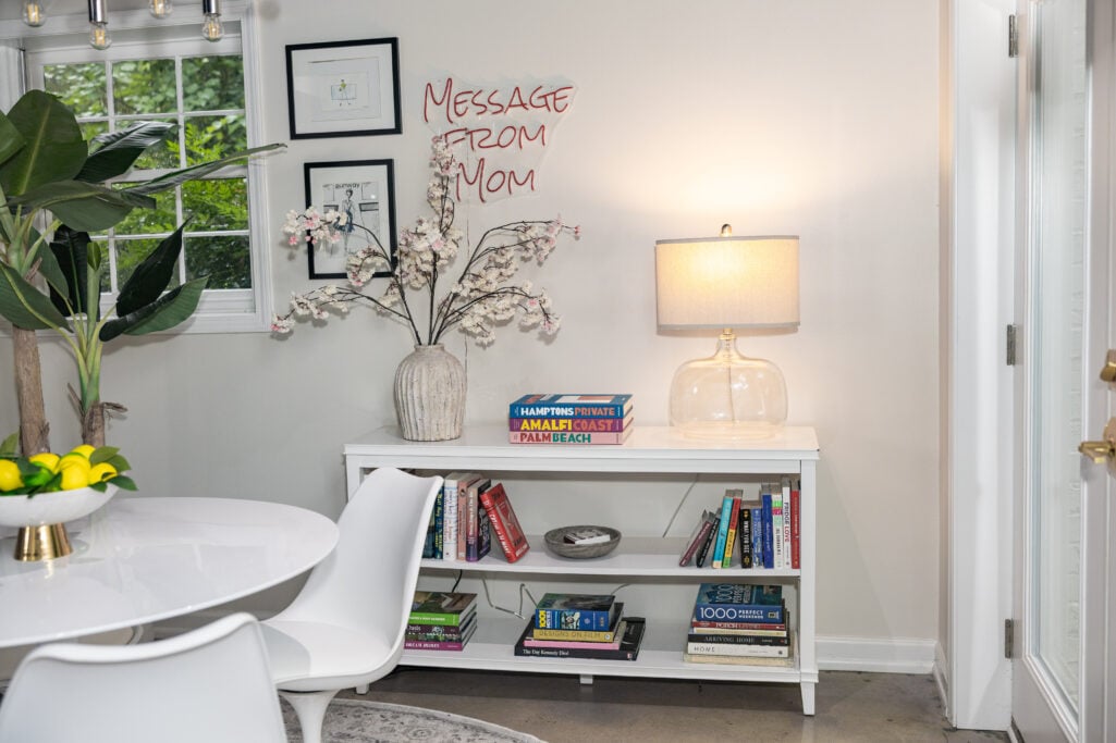 I layered in details that make it feel like me: a faux banana leaf tree and artificial lemons and limes housed in a pedestal bowl for that vacation-at-home energy, a bouclé pillow cover for softness and texture, and a stack of coffee table books—Hamptons Private, Amalfi Coast, and Palm Beach—because dreaming is part of the process. Cherry blossoms in a terracotta vase bring in a little life. And the handblown table lamp? It’s gorgeous, but it’s also integral for YouTube filming—good lighting is everything.