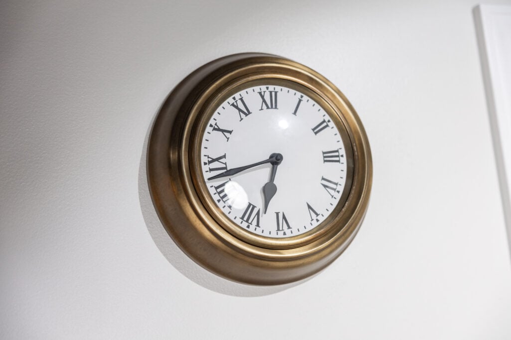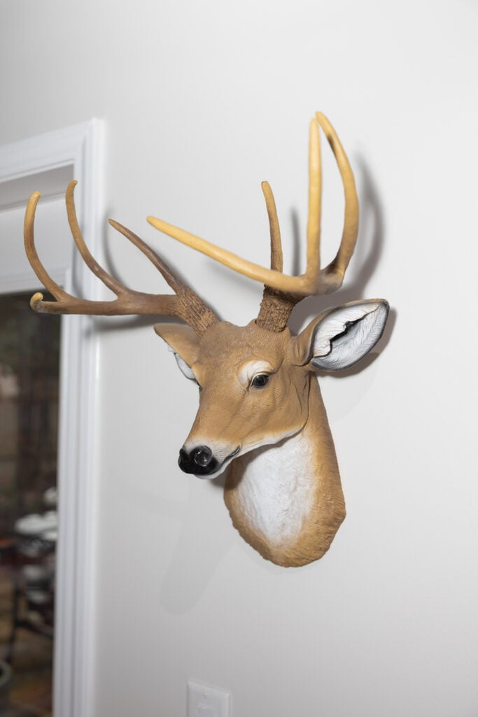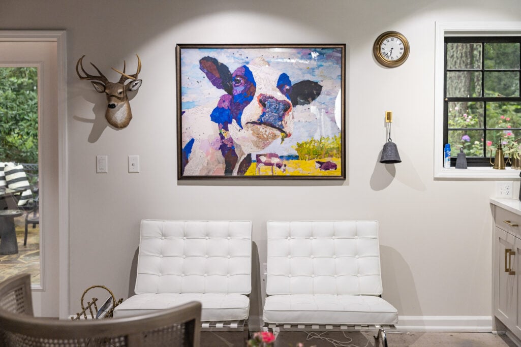 On the walls, fun and whimsical art that makes me smile: a deer head, a cow print, cow bells, and a paint spots print over the red cabinet. Because a room should have personality, not just furniture. There’s a brass wall clock—because in this business, time matters. Every single minute.