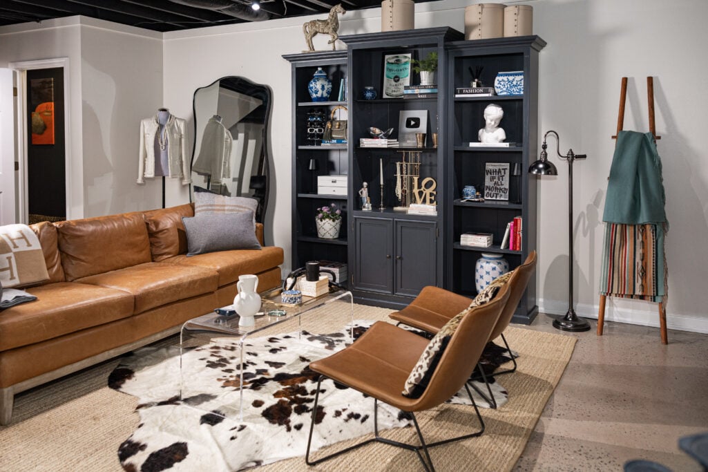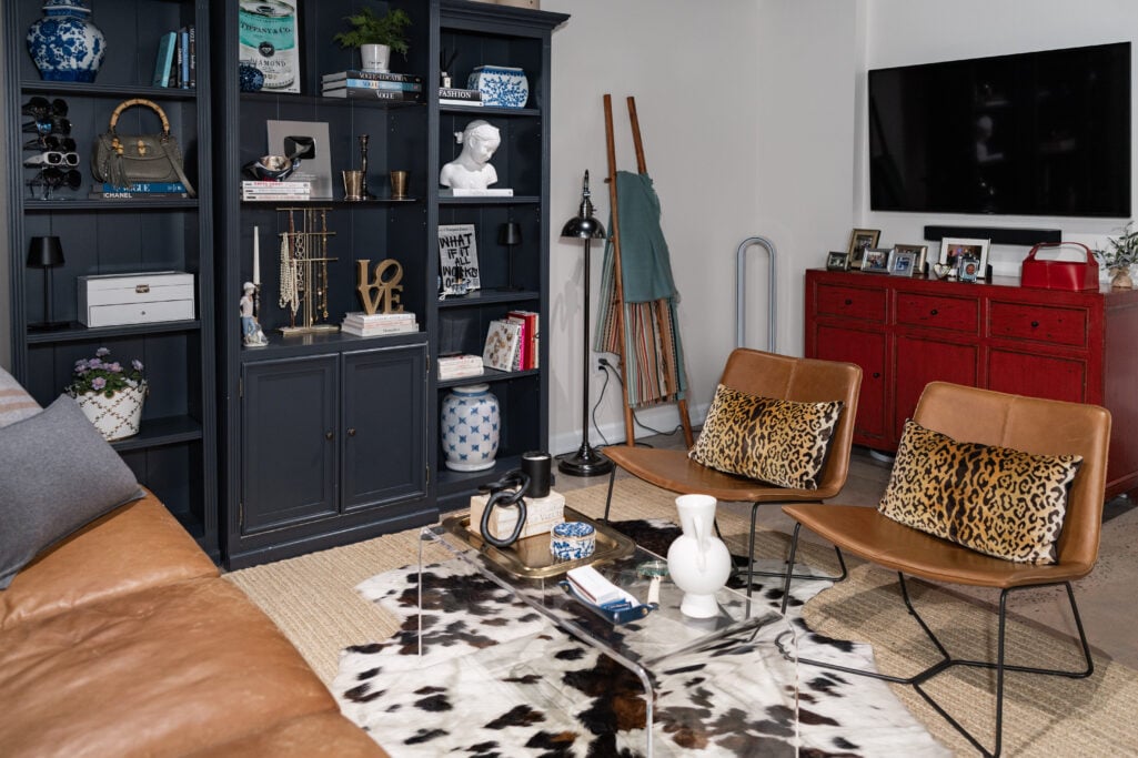 There’s a leather sofa, leather lounge chairs, and leopard pillows that bring that mid-century edge I love. An acrylic coffee table keeps things feeling open and airy—important in a basement where you want to maximize the sense of light and space.