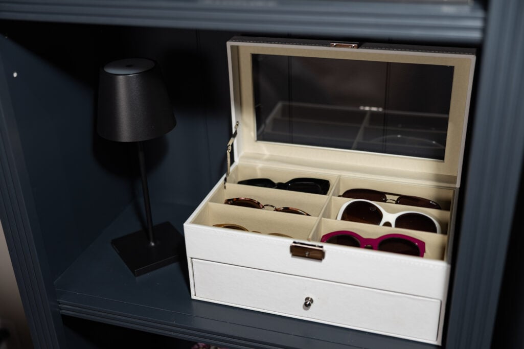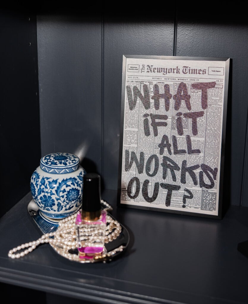 I had the Tuscan Bookcase painted French Beret—which sounds like a color and an attitude, and I’ll take both. I styled the shelves with a mix of practical and whimsical items—because we need a bit of both, right, Grit and Glam Club? There are touchless lights, a sunglass case, a ceramic bust, my “What If It All Works Out” print, a “Tiffany Diamond” Can print, and a Jo Malone diffuser that makes the whole room smell like a dream. And the concrete floors plus exposed ceiling give the room a modern edge that keeps everything from feeling too sweet or staged.
