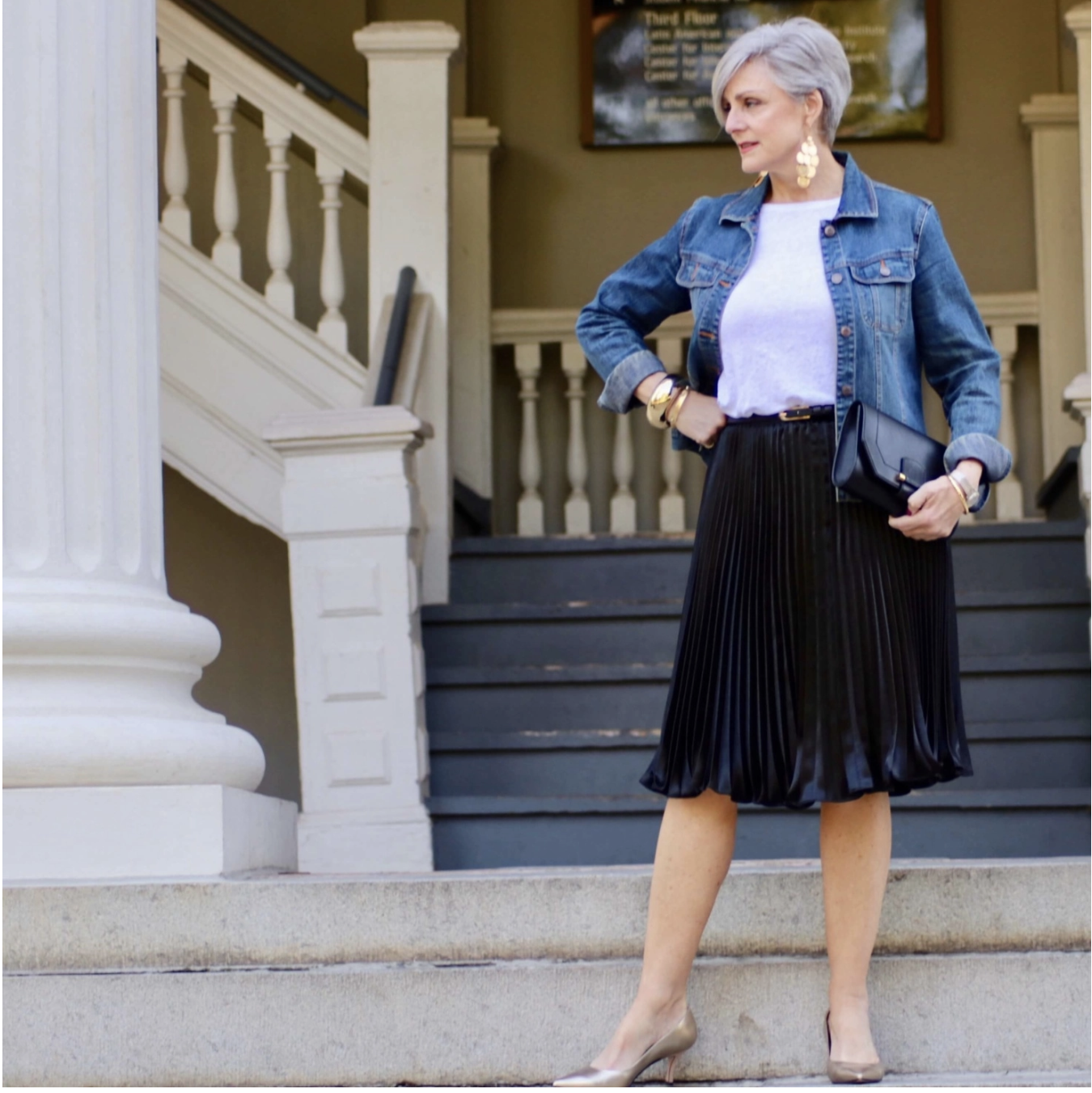 Classic Jean Jacket (Talbots) | Drew Pleated Skirt (Reiss) | Solid Pima Bateau Neck Tee (Talbots) | Anna Pointed Toe Pump (Naturalizer)