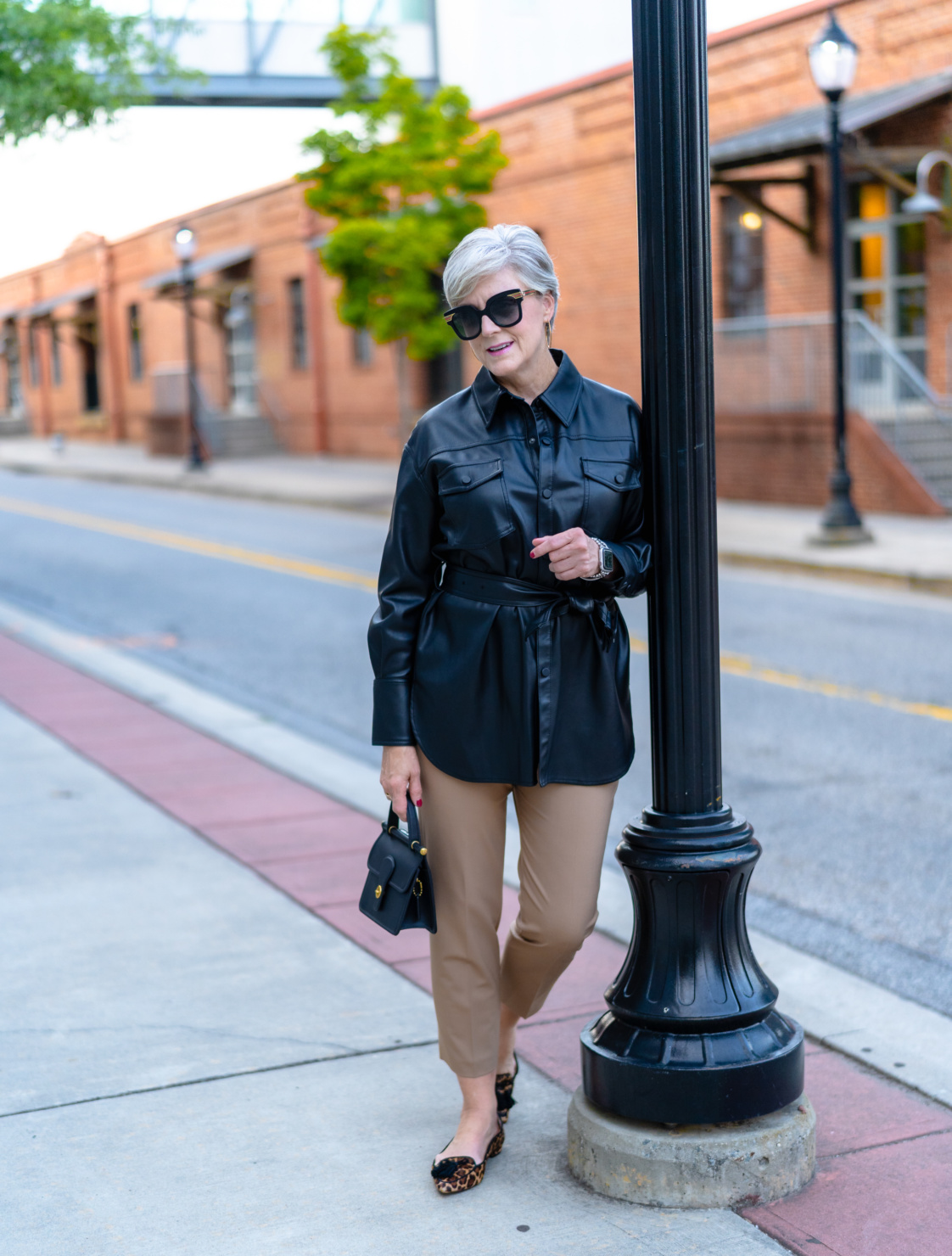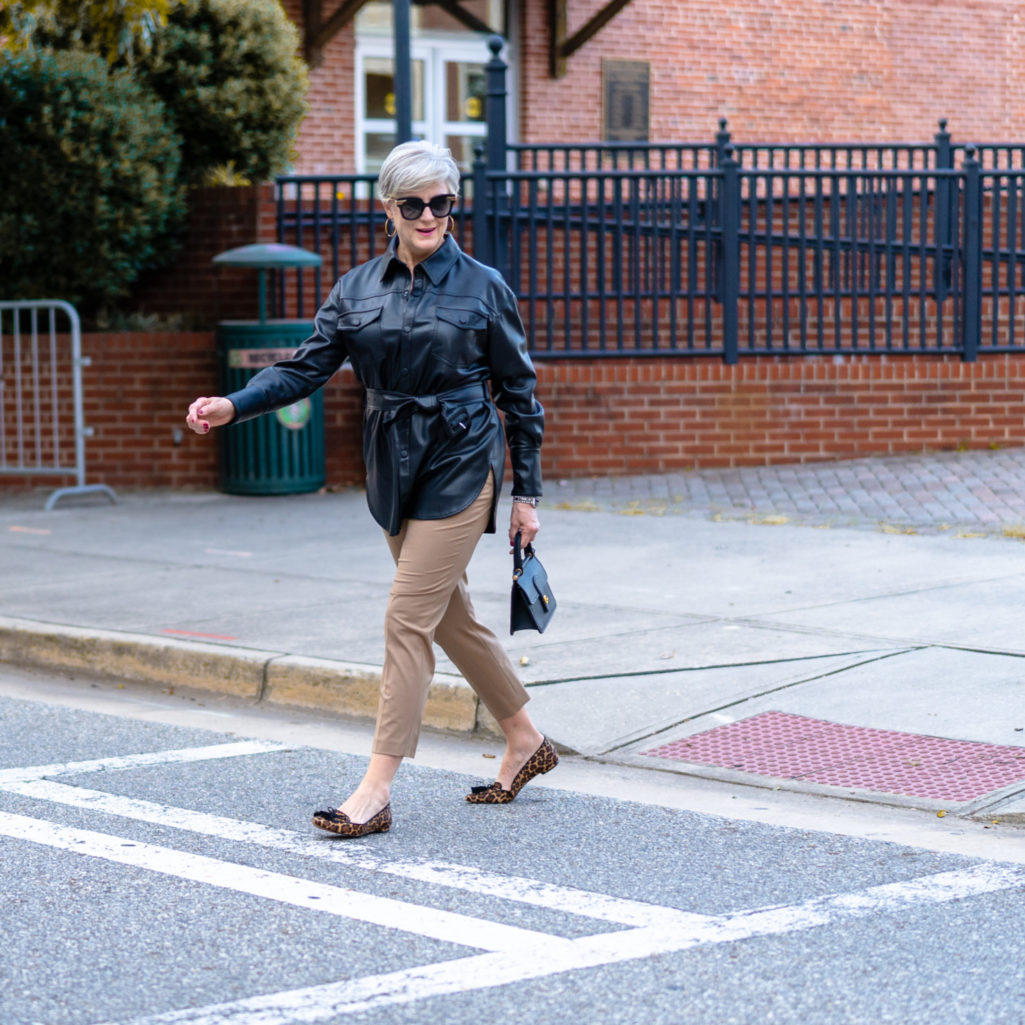 twice a year, fashion week takes place in New York, Paris, London, and Milan. trends trot down the runways for all the world to see. but it’s up to us to incorporate those trends into our wardrobes. this one tip will help over 50 women stay modern, fresh, and relevant. will you like every single trend that’s introduced? most likely not. but i’m certain there will be one or two trends that will suit your style aesthetic. shirt jackets are all the rage this year, with bold patterns on display. but i decided a shirt jacket in faux leather from Banana Republic was more to my liking. it’s paired with straight-leg pants from Theory for a classic yet on-trend look. leopard shoes add texture to this outfit, but the mini handbag from Coach keeps this outfit grounded in 2021.