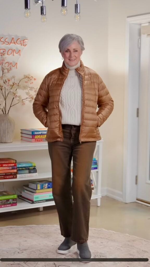 The structured jeans and fitted turtleneck keep the silhouette clean — no Michelin Man moments.