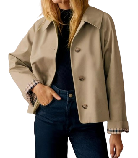 Why It Works: This is the trench coat’s cooler, more modern sister. A cropped trench jacket gives you that classic sophistication without the bulk of a full-length coat—perfect for transitional weather when you need a layer but don’t want to feel weighed down. The shorter length works beautifully with high-waisted jeans and trousers, and the plaid-lined cuffs add an unexpected detail that feels elevated.