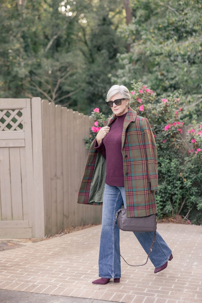 Alternative Plaid Coat | Alternative Burgundy Sweater | Denim Trouser Jean | Burgundy Suede Boots