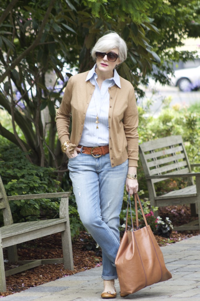 for this blue jean mama, nothing can compare with a faded pair of jeans. way back in the day, before calvin klein came along and revolutionized denim to designer status, there wasn’t much of a selection besides a pair of levi’s. and, way back in the ‘seventies when denim had not a bit of stretch, and i weighed in at 115 lbs. that was perfectly fine. thank goodness times have changed! i love the selection of denim that’s available nowadays. i also love the different rinses blue jeans come in, my favorite is a dark rinse, but there’s something to be said about a faded rinse. years ago, if i wanted to fade my jeans i had to carefully add bleach to the washing machine, being ever so careful as to not make splotches on the fabric. or if i wanted a pair that fit like a glove, most likely i had to lay down on my bed, suck my stomach in, and zip…but all of that has changed. take a look at my perfectly faded denim for today’s ootd that fit my body to a ‘t’ thanks to a bit of lycra. i’ll always love to don a pair of blue jeans, after all, i’m an american girl through-and-through. add a button-up shirt, a simple cardigan, ballet flats, and i’ve got a look that’s american classic – casual and chic.