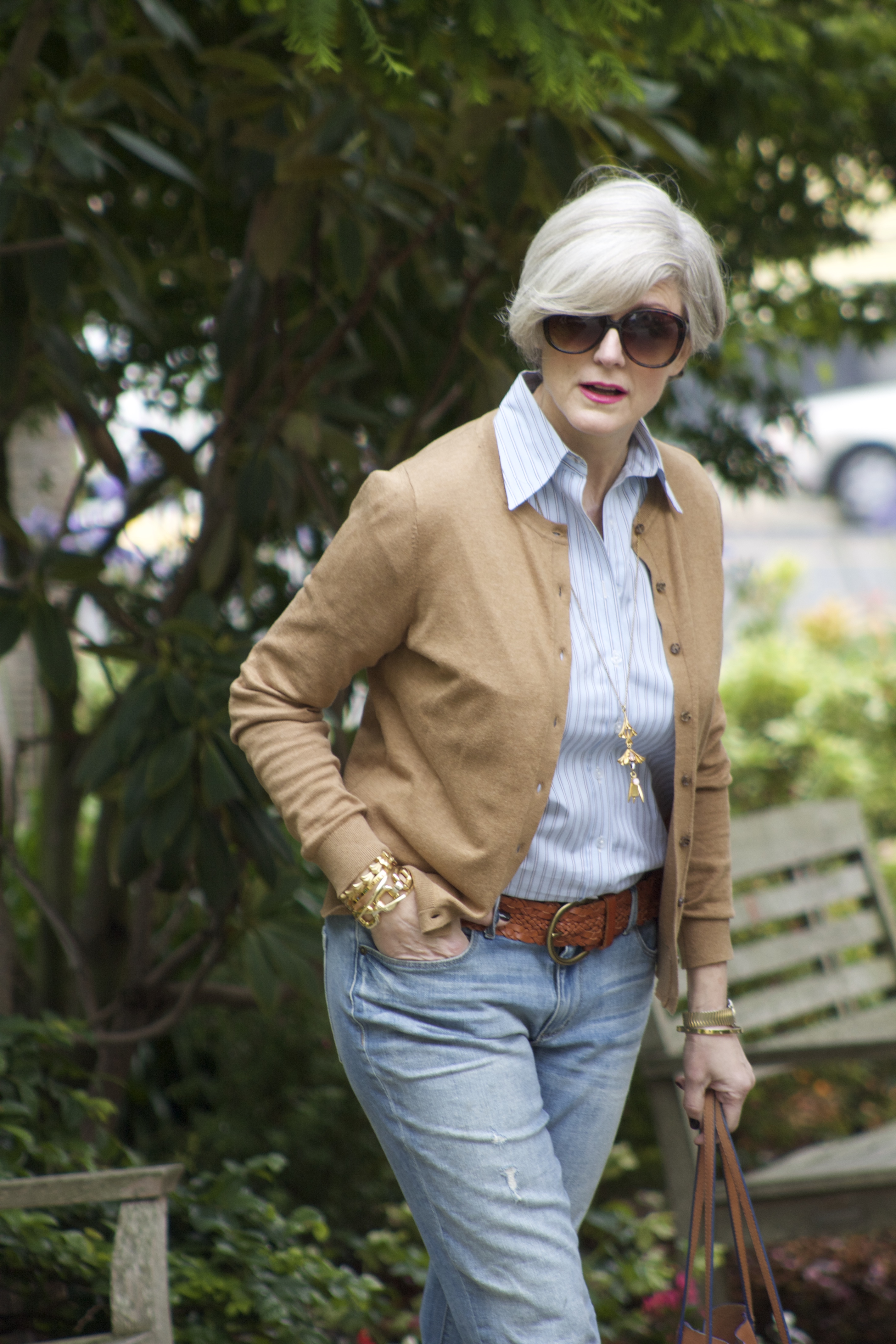labels: denim and cardigan Loft; shirt tailor-made; shoes Ralph Lauren; tote Madewell; belt Banana Republic