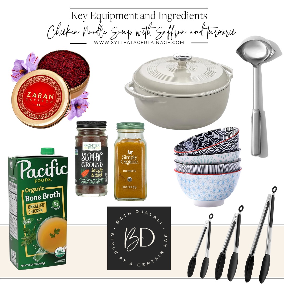 Ground Sumac | Unsalted Chicken Bone Broth | Zaran Saffron | Set of 4 Ceramic Bowls | Lodge 6-qt. Dutch Oven | OXO Stainless Steel Ladle | Silicone-Tipped Tong Set | Turmeric