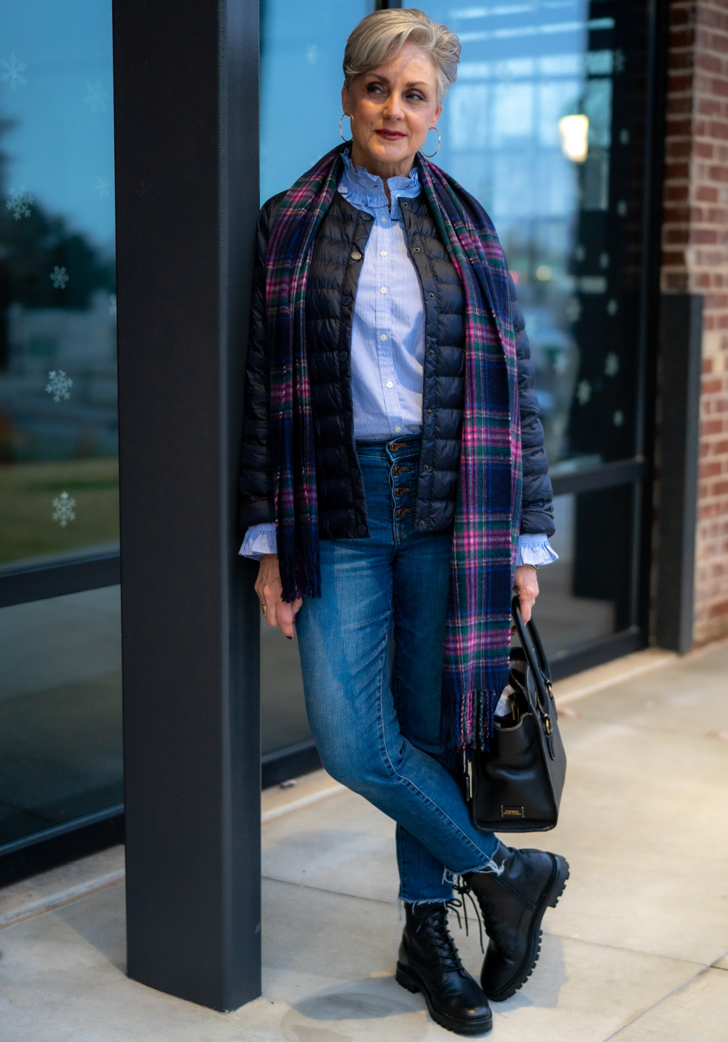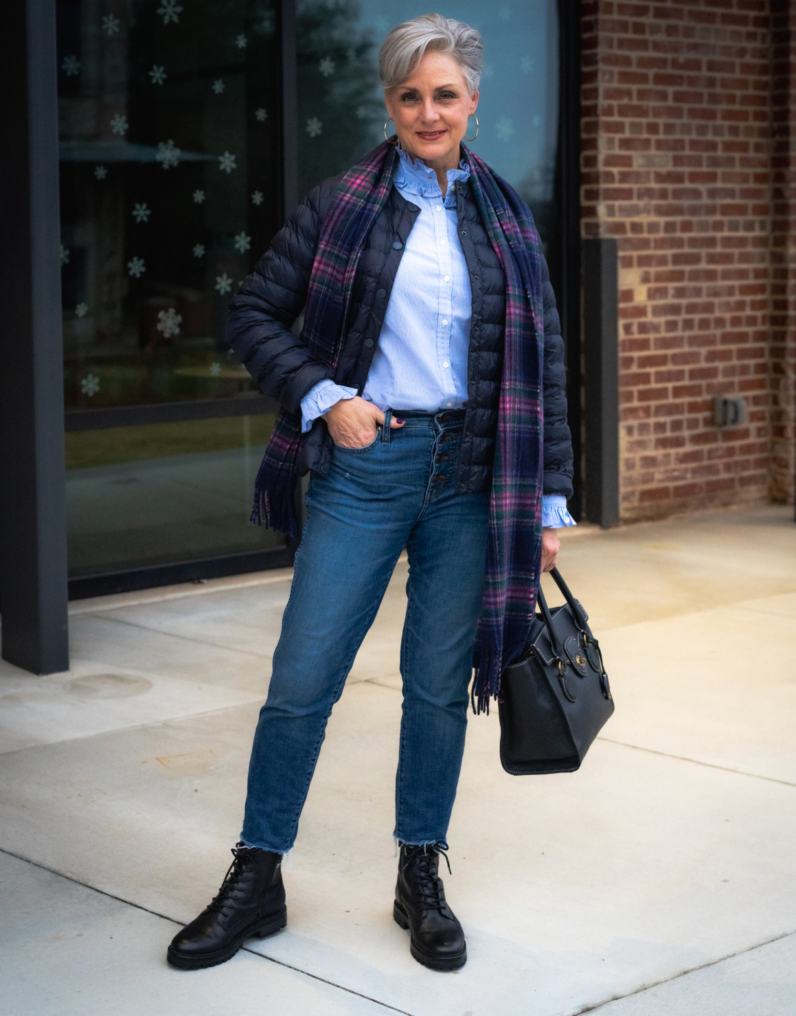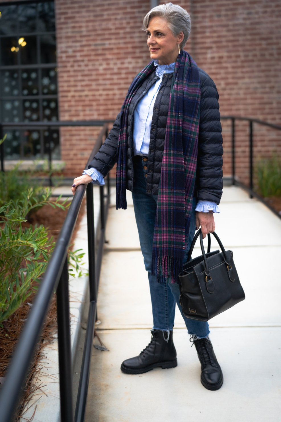 Lovely outfit – the blue blouse is especially fetching and I love the pink in the scarf. Here in Florida, puffer jackets give way to puffer vests. I agree with the boot theory. I treated myself to some Doc Martens a few years back but went with black velvet vs leather just to soften them up a bit. Thank you for all the work in 2021. I look forward to 2022 with you!