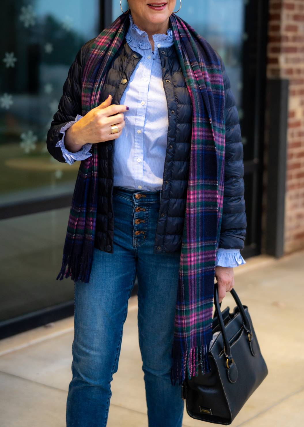 denim (similar) | ruffle neck blouse | puffer coat (similar) | puffer coat (similar 2) | puffer coat (similar 3) | puffer coat (similar 4) | cashmere scarf (similar 1) | cashmere scarf (similar 2) | cashmere scarf (similar 3) | boots | handbag (similar) | handbag (similar 2)