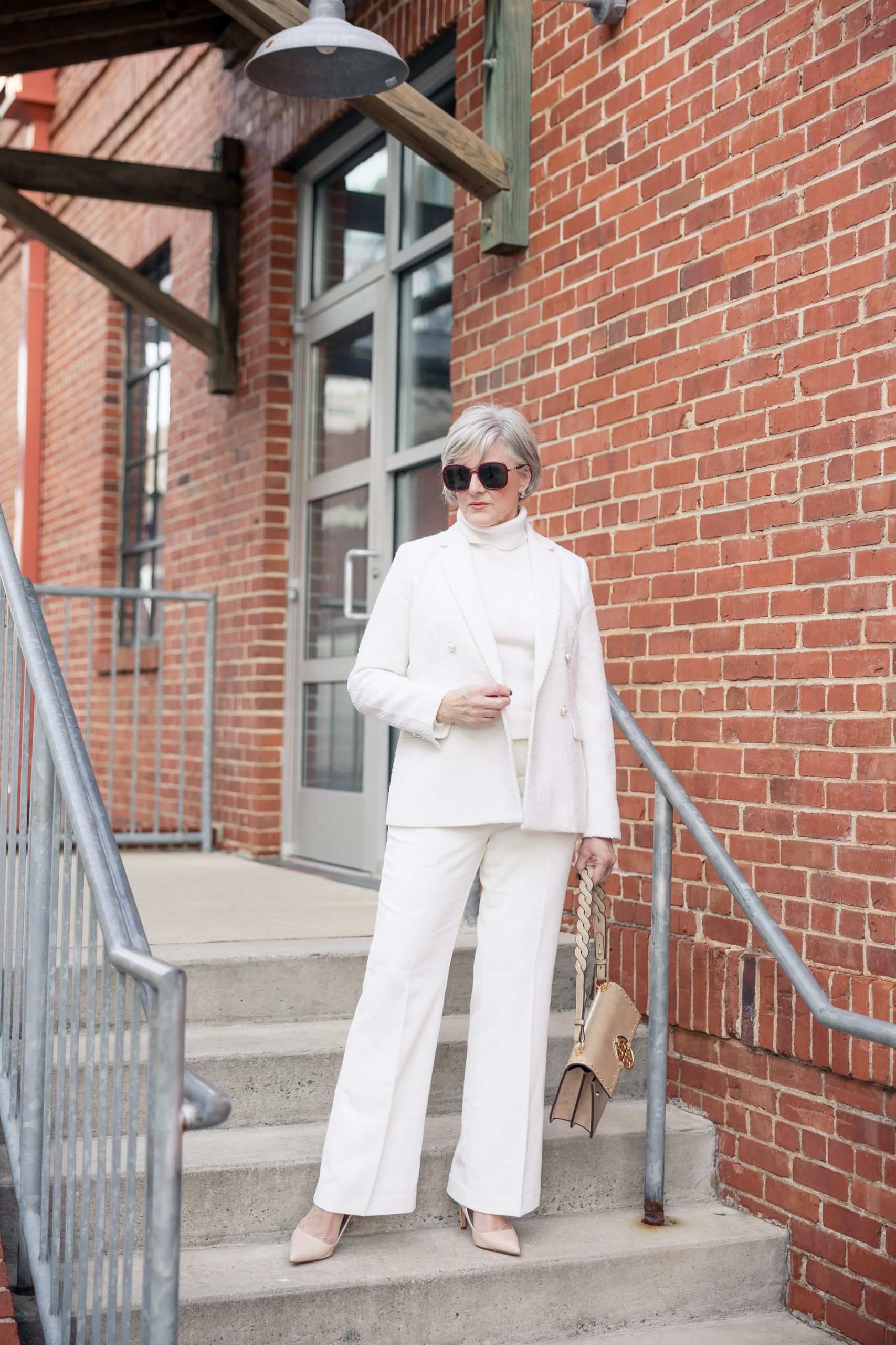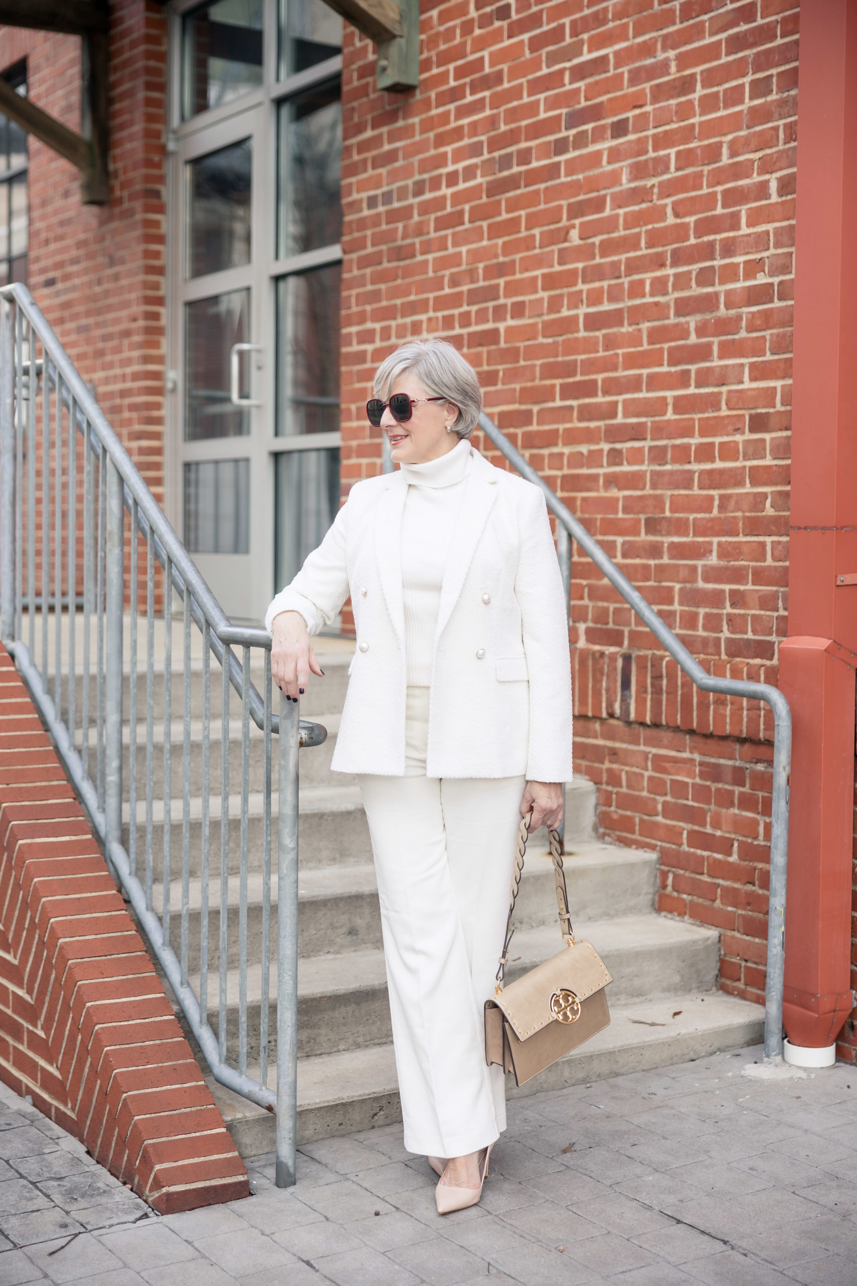 Happy Monday, gang! No singing the blues here, as I’m decked out in head-to-toe neutrals. Winter white or ivory is a perfect color scheme to reach for during the gray and dreary months of January and February. We’re continuing with a topic I started last week: monochromatic dressing. Embracing the monochromatic trend is a chic, fashion-forward formula with many benefits.