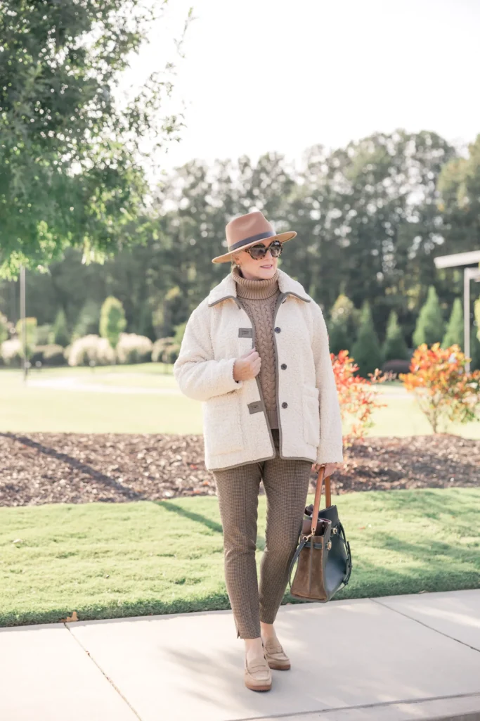 Faux Shearling Jacket | Chunky Turtleneck | Plaid Pants | Suede Loafers | Lee Radizwell Handbag | Wool Fedora