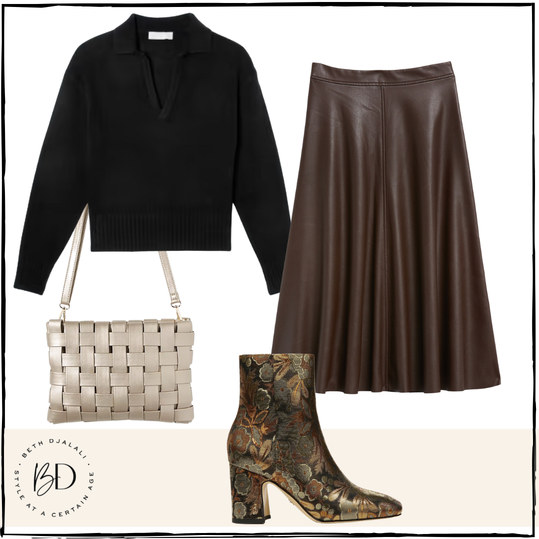 Board: Petite Vegan Leather Midi Skirt (Banana Republic) | Sam Edelman Block Heel Bootie (Nordstrom) | Vince Cashmere Polo (Everlane) | Lindy Woven Clutch (Anthropologie)