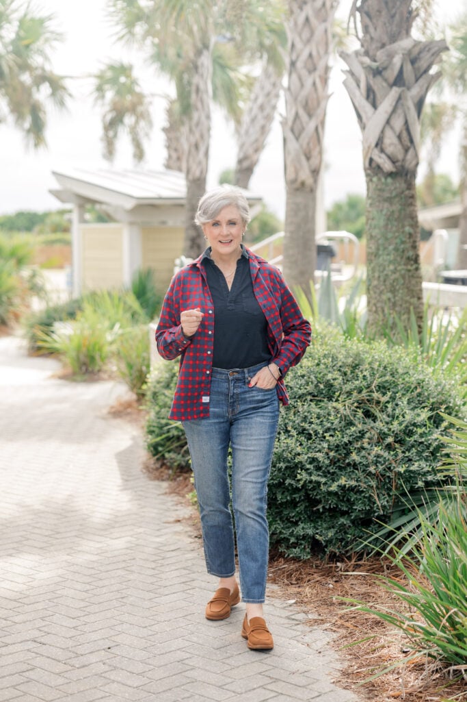 Color analysis can be a helpful starting point, but it’s not a lifelong sentence. If your chart says “no black,” but you feel powerful in black? Wear it. If a red lipstick lifts your mood, that’s reason enough. I love pink! It’s my signature color. But I can’t imagine wearing it every single day. I also love yellow. I know, I know that this particular yellow windowpane jacket from J. McLaughlin is sold out. But they carry the same jacket in blue. See what I mean? Pink, yellow, or blue, I love them all.