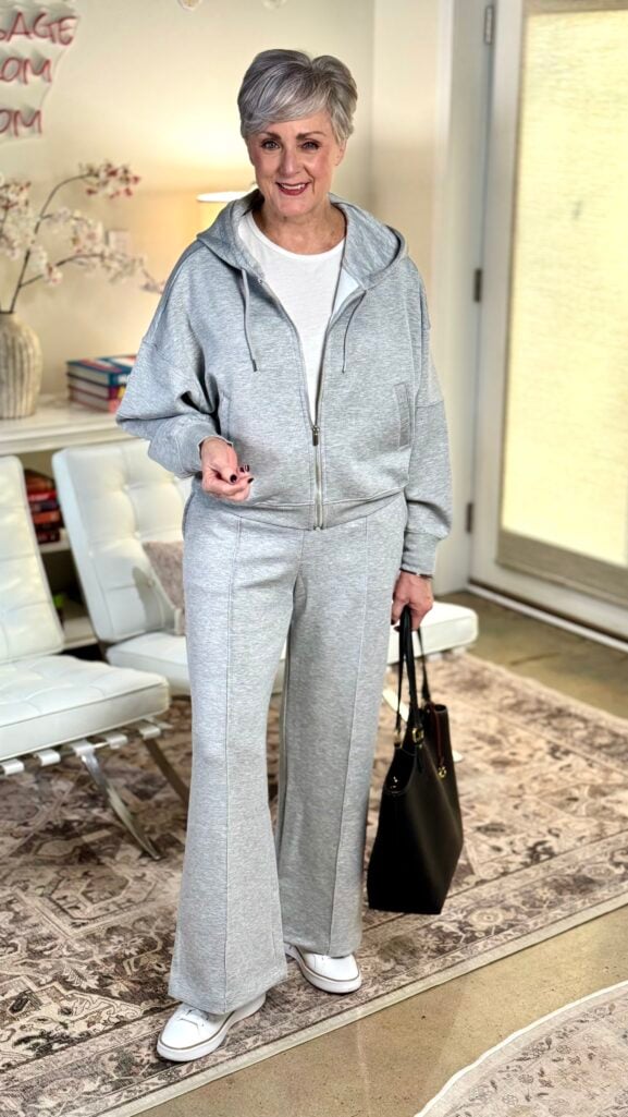 Under forty dollars, and it looks like I spent ten times that. Everything new in this outfit is from Walmart’s Scoop line. The Scubaknit Barrel Hoodie — fourteen dollars. The Scubaknit Seamed Sweatpants — twenty-one. That’s thirty-five dollars for a matching set.