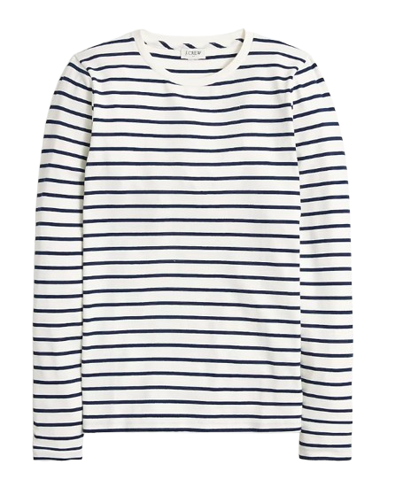 Add a metallic flat from your closet for a modern wink, or a sandal when the weather warms up, to keep it streamlined. Either way, this looks like you just stepped off a sailboat — in the best possible way. And the beach sweater works with jeans, with a midi skirt, layered under a blazer. Investment basics.