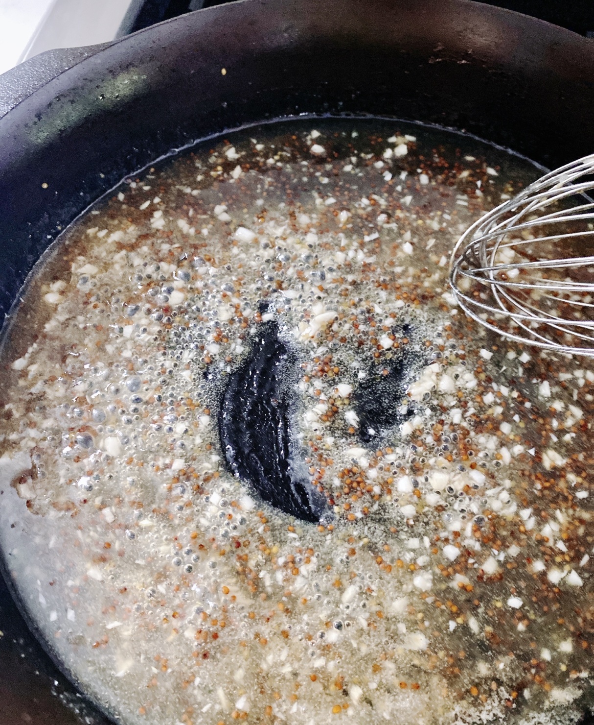 Over medium heat, pour in your bacon fat, vinegar, whole grain mustard, dijon, salt, pepper and sugar. Whisk to combine and bring to a simmer.
