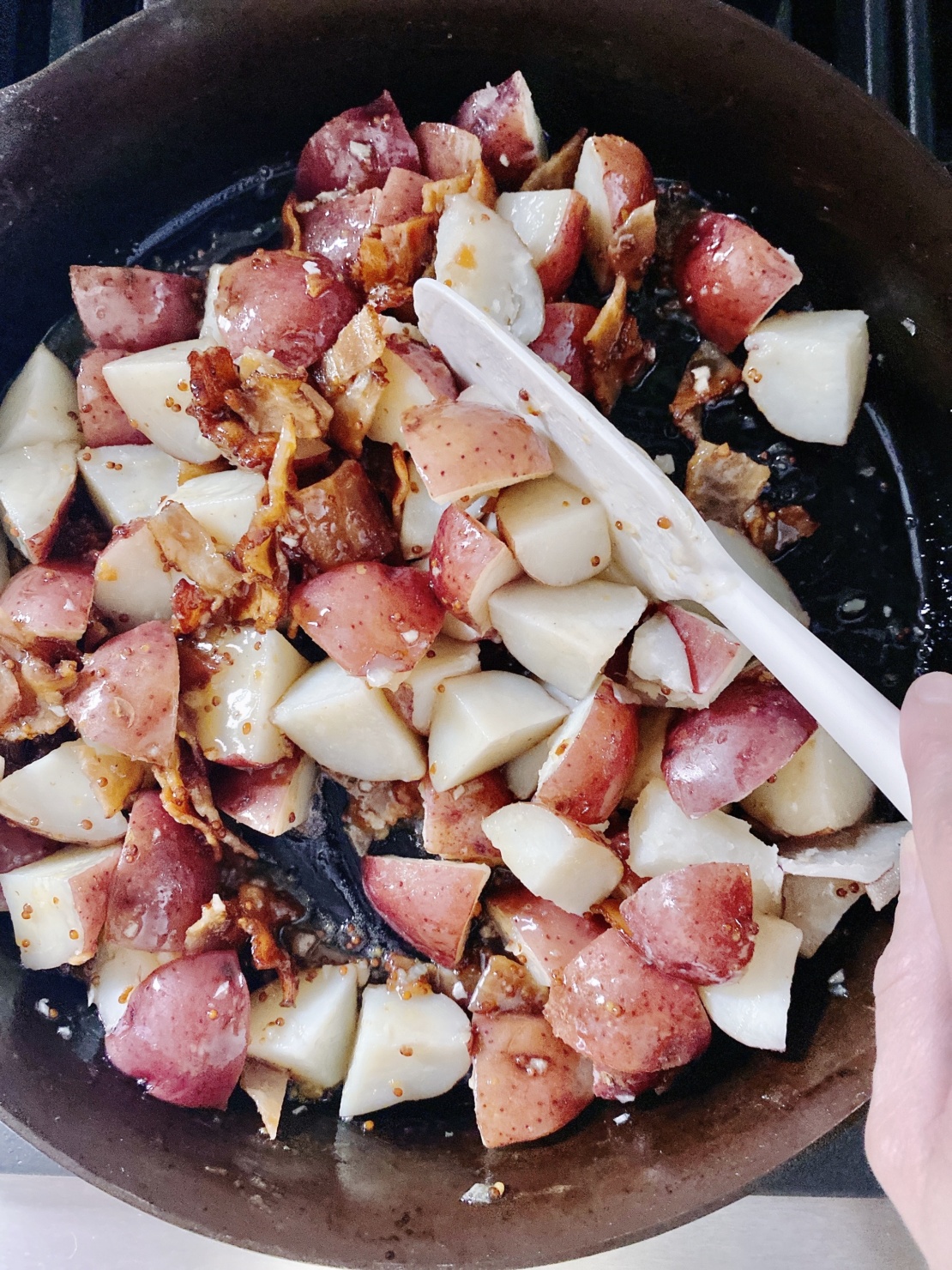 Once the potatoes are done and drained, take the bacon grease you collected and add it to a large skillet or dutch oven. Since I only have one pound of potatoes, my cast iron skillet is big enough, but if you’re using two pounds of potatoes you’ll need something bigger to mix everything well.