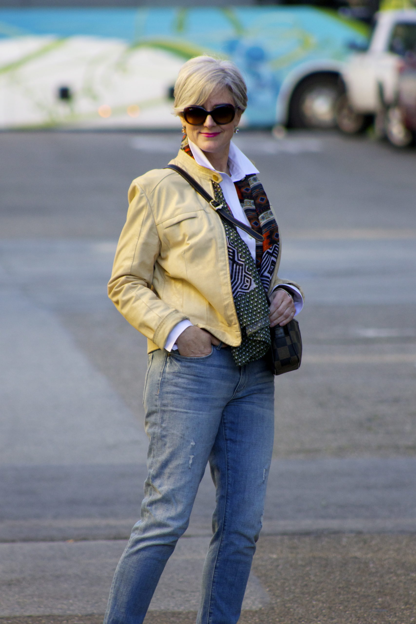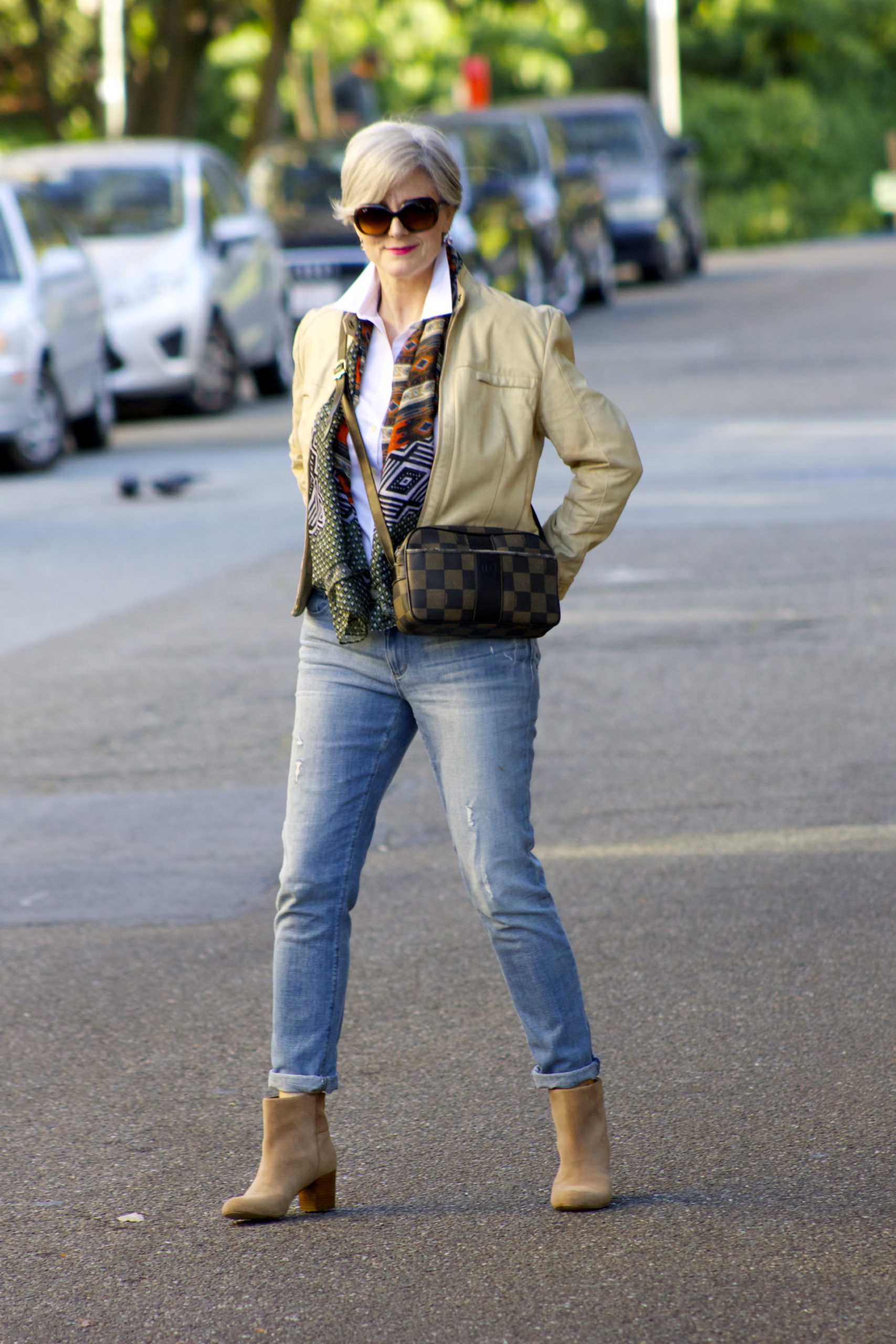labels: denim @Loft; shirt and booties @BananaRepublic; leather jacket @NicoleMiller; scarf @Zara; sunglasses @RayBan; handbag @Fendi