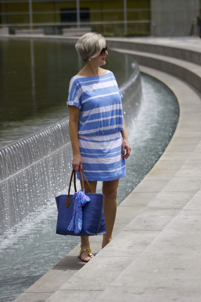 labels: dress Lilly Pulitzer (similar here); tote and sandals Lilly Pulitzer by Target