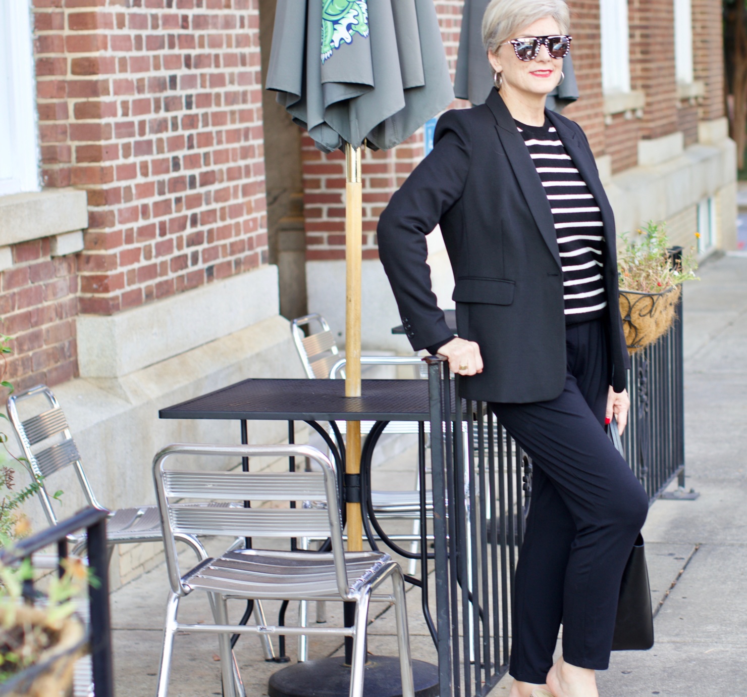 throw a blazer over the top for a chic evening look. this one is oversized and the perfect look for the weekend.