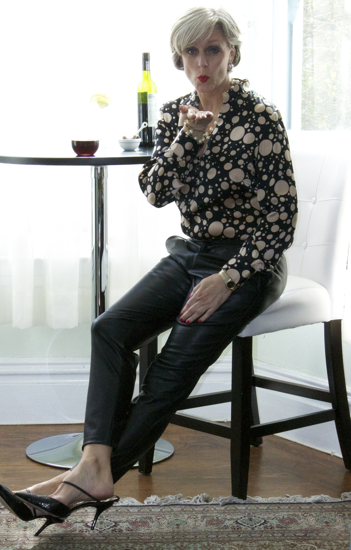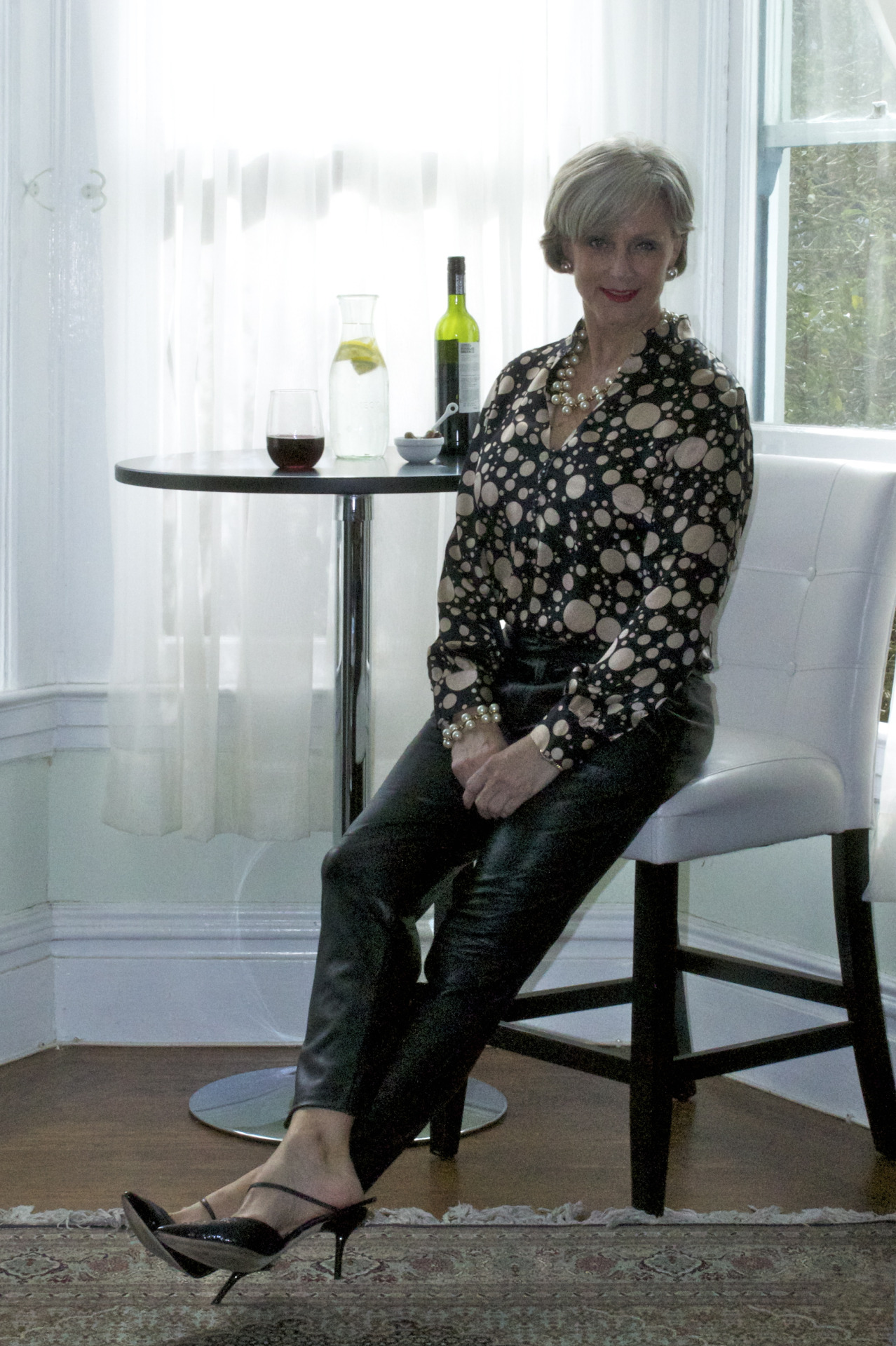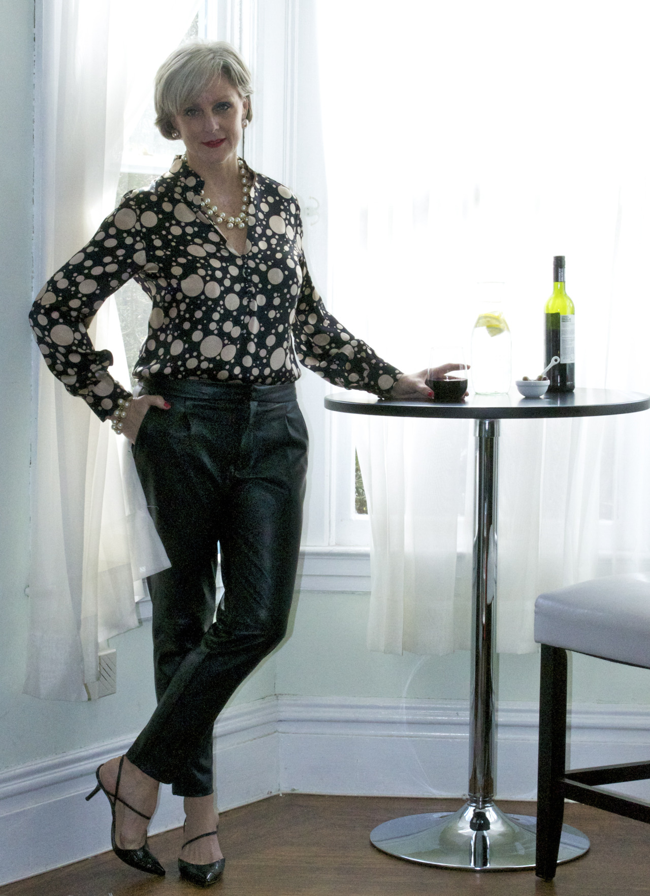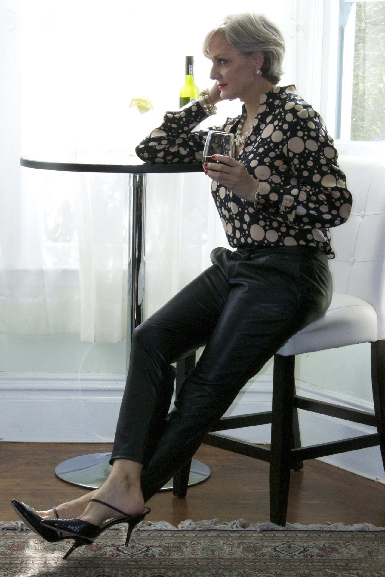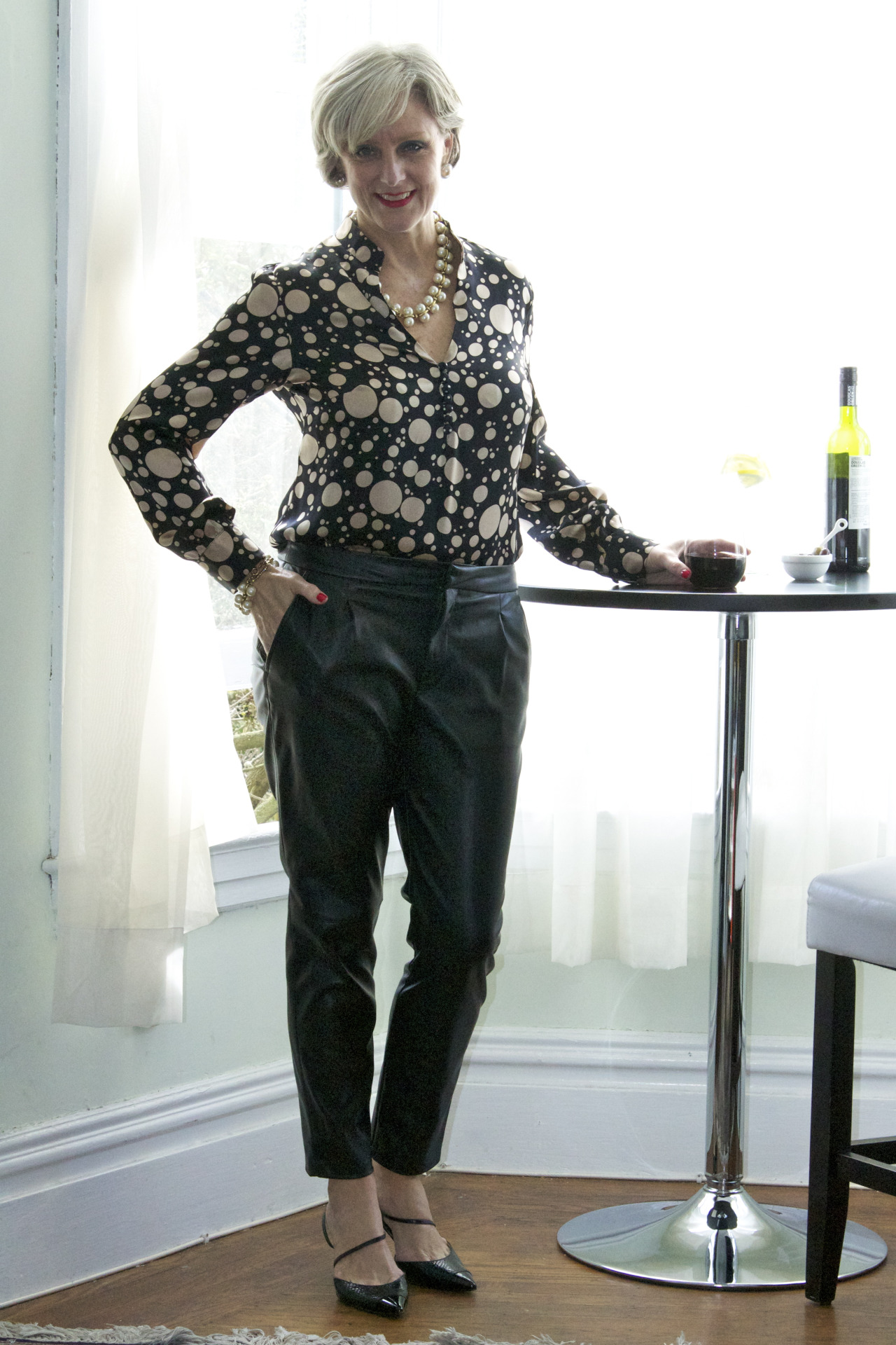leather pants by Zara; shirt by H&H tailors; shoes by Ivanka Trump; necklace and bracelet by JCrew